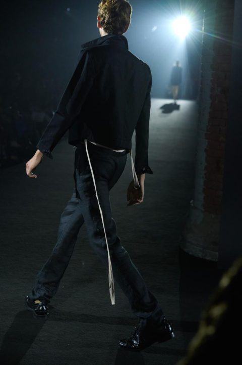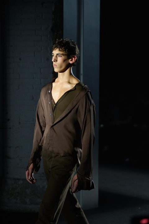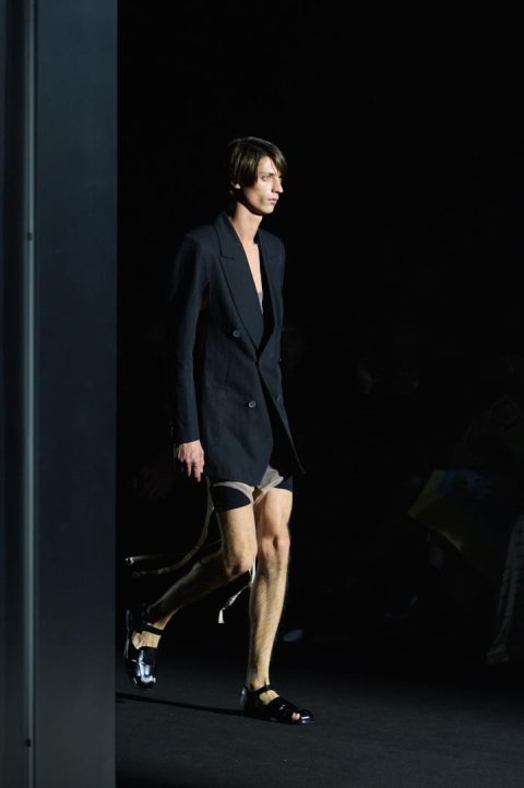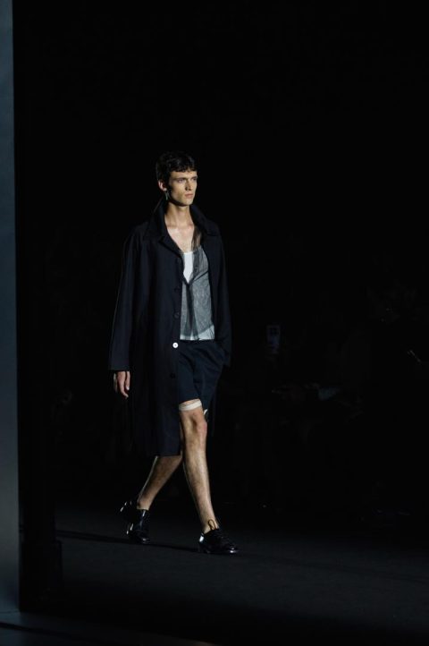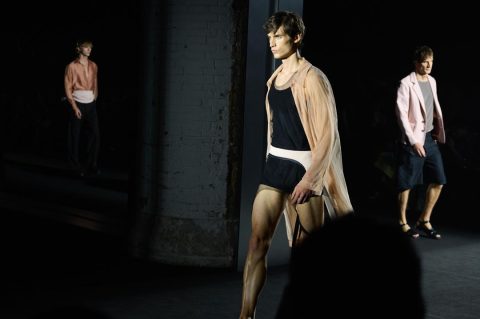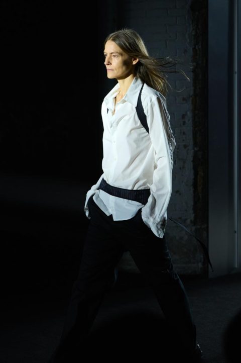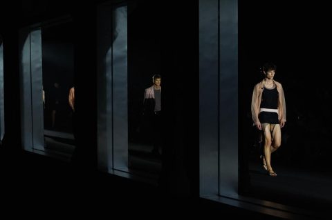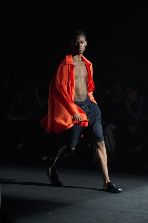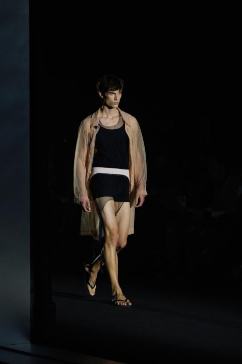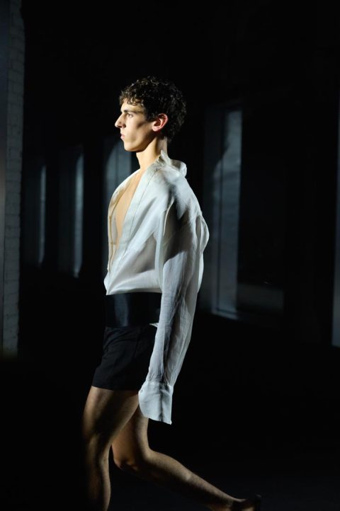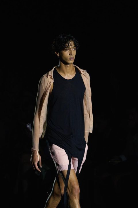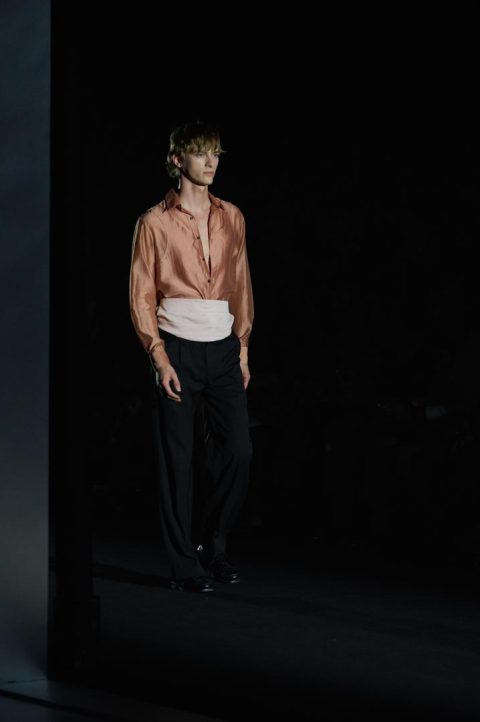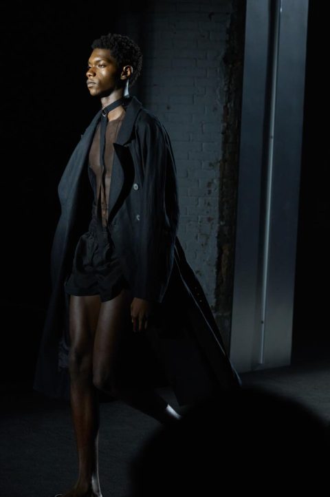 The designer bases her inspiration on the codes of lingerie—sheer fabrics, straps, hidden closures—revisited through the lens of men's tailoring. This intimate universe translates into a collection that questions menswear from within, situating itself ambiguously between formal and informal, visible and invisible.