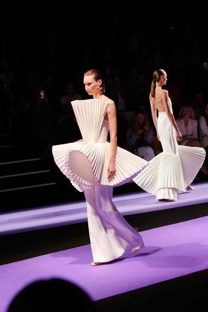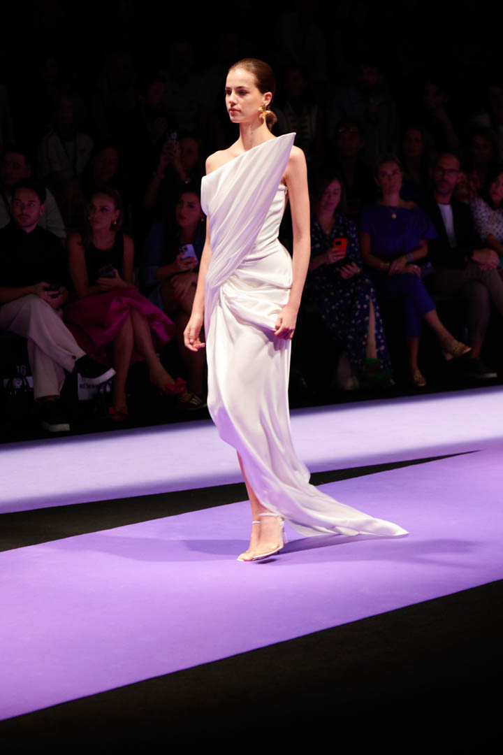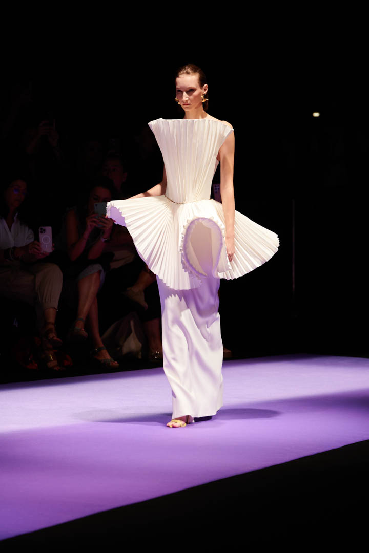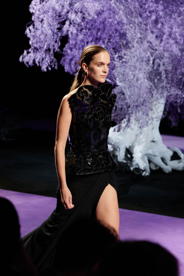 The fashion designer, from Valencia, together with her daughter Paula Maiques, creative directors of this firm, invite all of us to enjoy at their fashion show, held at Mercedes-Benz Fashion Week Madrid, a summer of pure and geometric volumes. Among their starring garments the tuxedo stands out presented in a renewed version, alongside coats, wrap dresses and mini dresses enriched with floral details. Notable are complex pleats that simulate ceramic vases, as well as micro-soleil pleats masterfully handcrafted. In the collection we also find very feminine elements with lingerie details. The color palette is dominated by black and white, which are allied with soft, light and romantic tones such as lilac, purple and yellow.