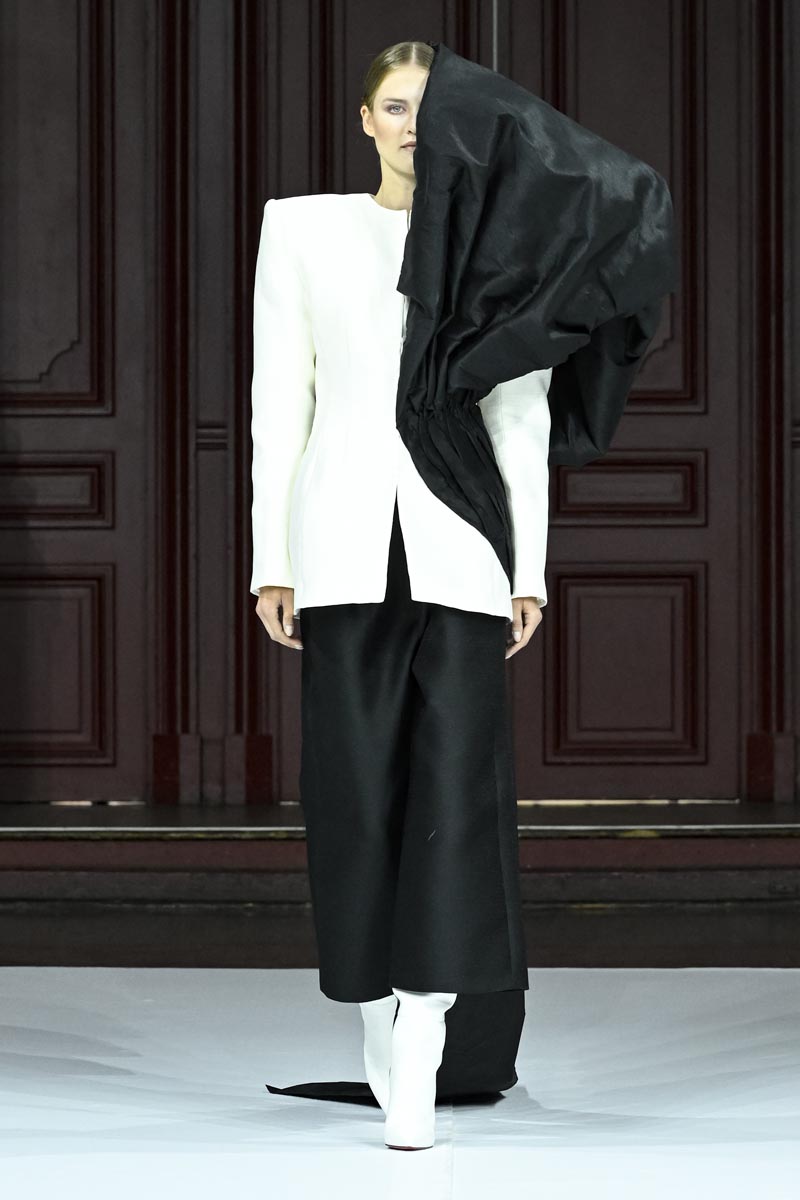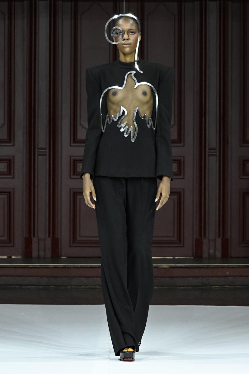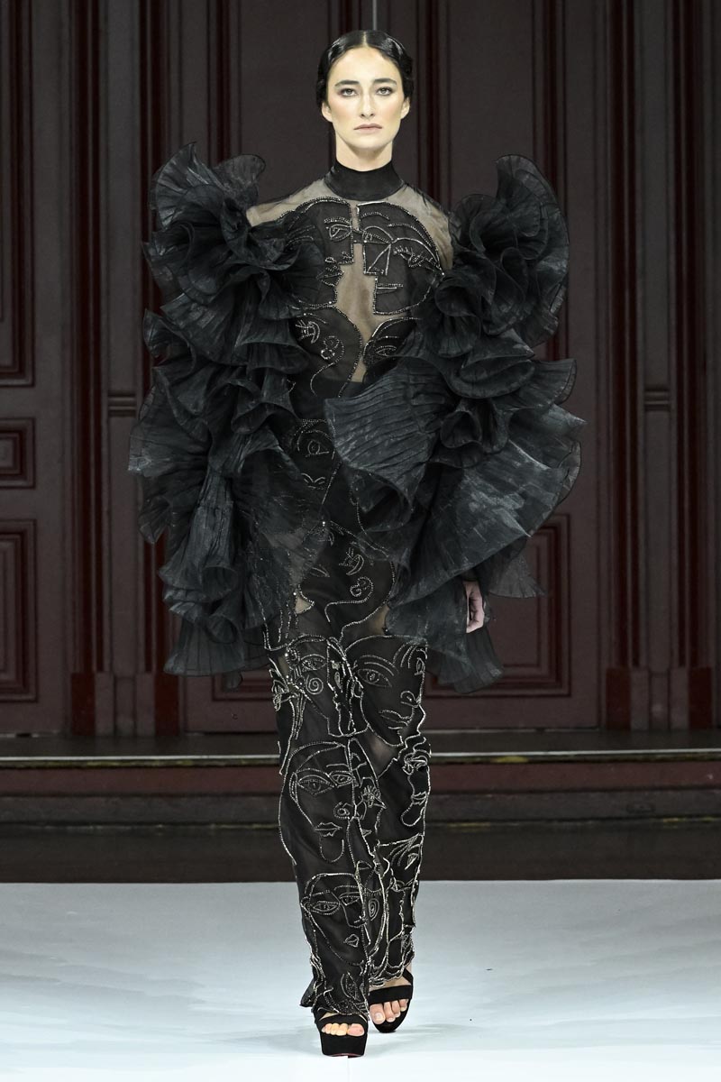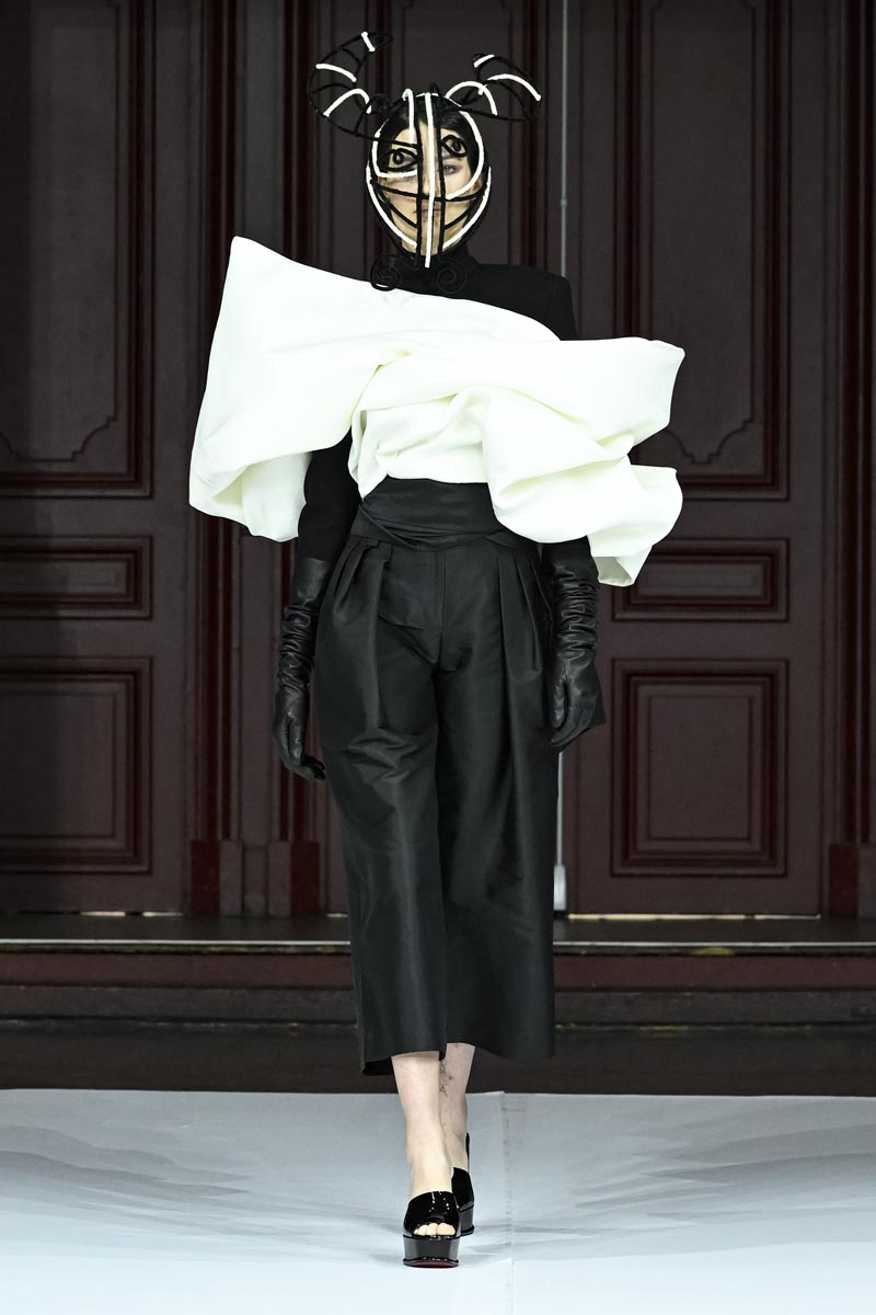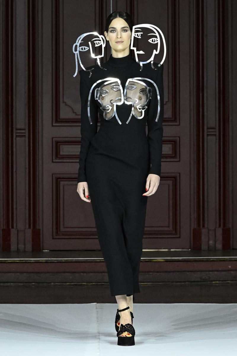 In “Fauves” the designer moves away from colour and, true to herself, presents a collection of monochrome looks, in white, beige and black. Abstract volumes, pleats, theatricality in the garments and many allegorical elements endowed with great symbolism such as faces, eyes and other elements are present in metallic and embroidered glass applications, which come out of the garments, creating a “three-dimensional” effect.