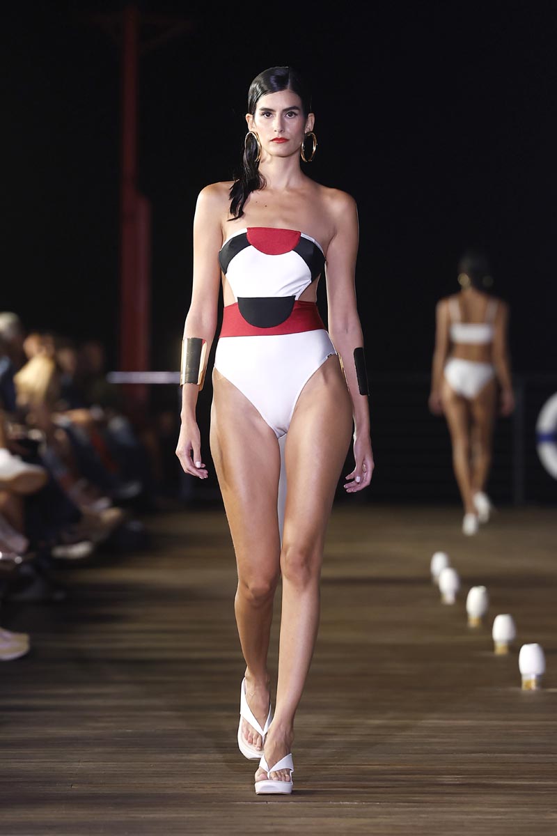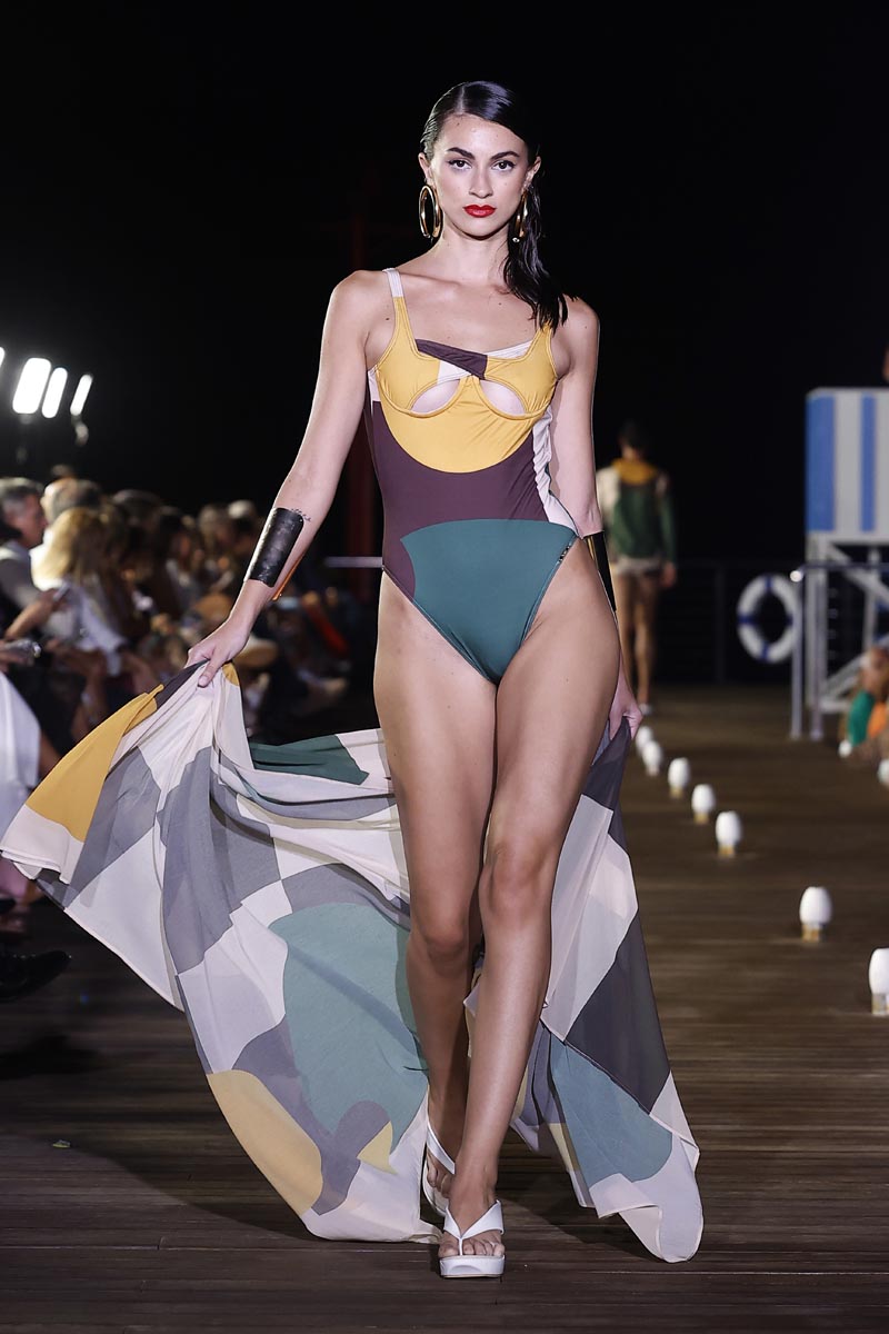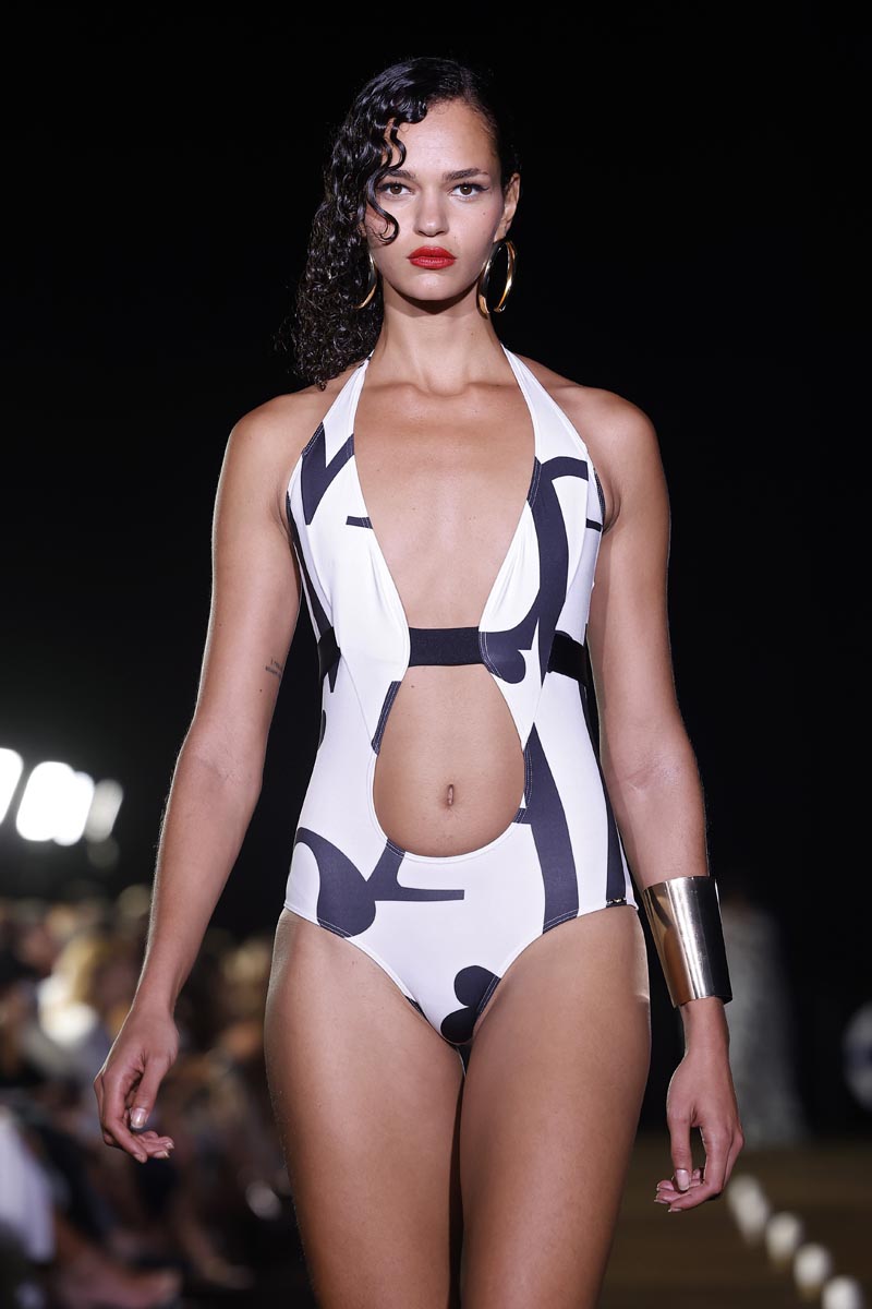 The Palmas “Línea” collection follows the line marked by the acclaimed Palmas Bridal 2025 collection, “Esencia”. Inspired by 1970s pop art and geometric minimalism, “Línea” incorporates a touch of futurism. Exclusive prints with geometric and abstract shapes are applied on fabrics such as lycra and chiffon, giving life to swimwear, bikinis and outerwear in a wide variety of shapes and cuts for both men and women. The designs are complemented by gold appliqués and accessories that elevate each look, adding a touch of sophisticated elegance.