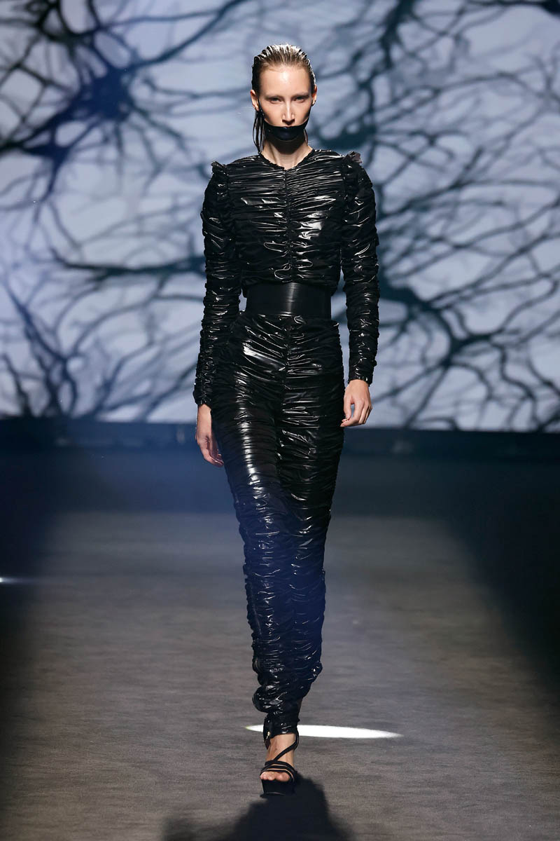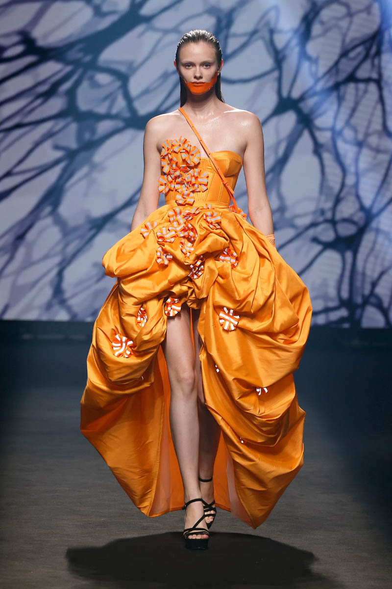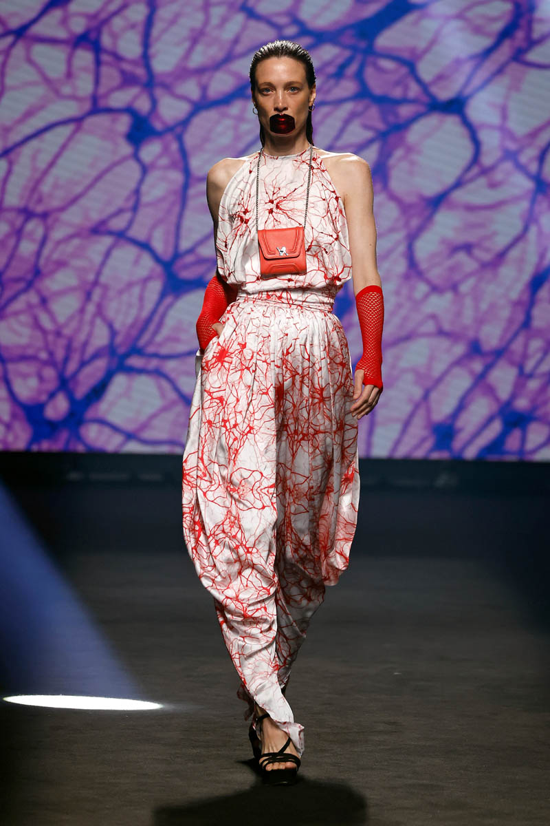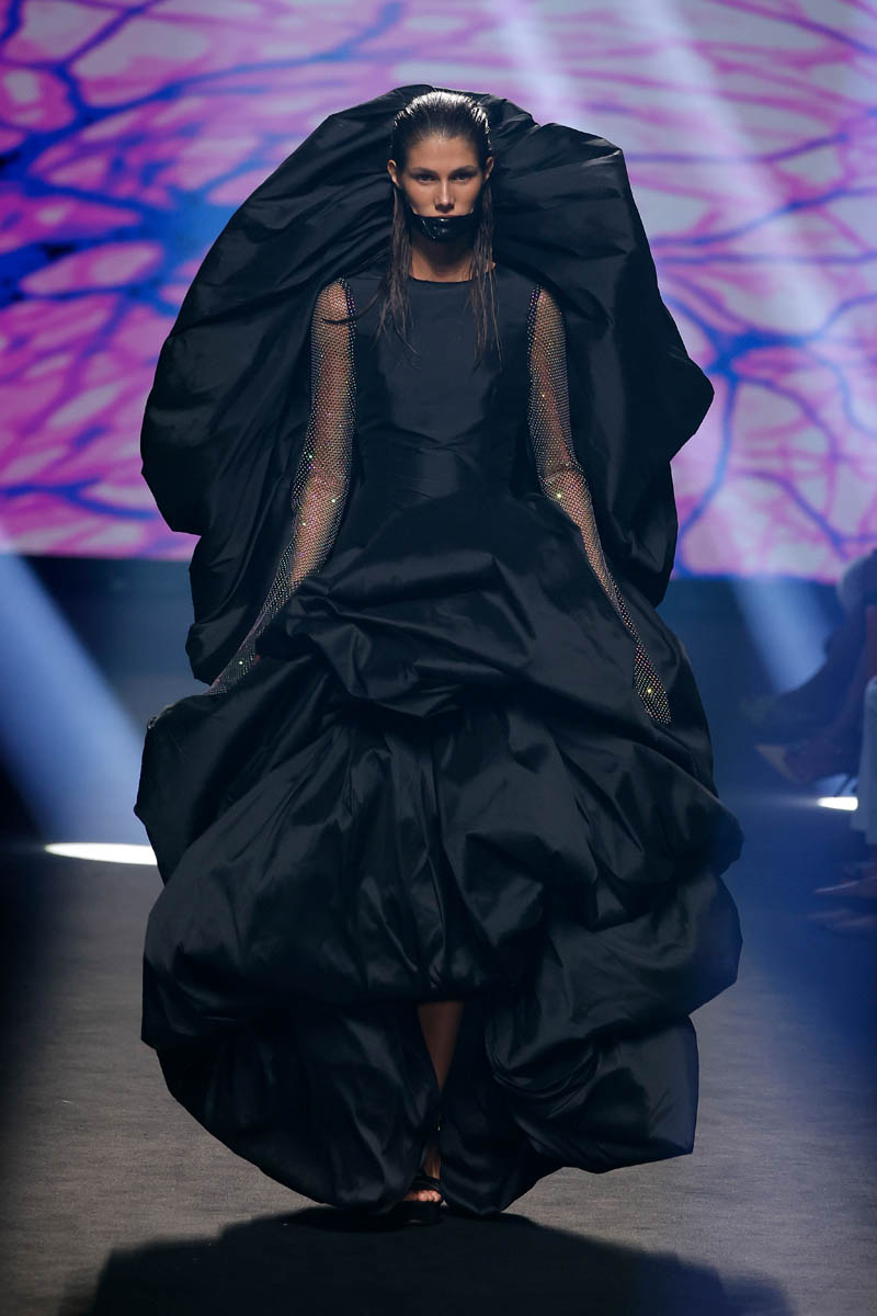 Robertodiz uploads to the Mercedes-Benz Fashion Week Madrid catwalk a very surprising collection for which he has collaborated with Benjamín Bulnes, with whom he has made chrome masks that are created from biomechanical engineering, thus converting the models into super heroines of the future.