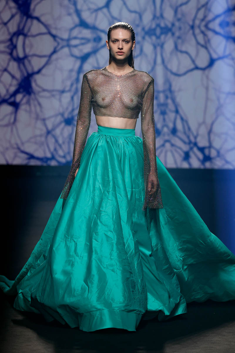 Trousers are presented as an essential garment in a more colorful collection than previously showcased by Robertodiz. Raffia and mesh embellished with crystals are the protagonists of very sophisticated looks destined to be paraded on the red carpet.