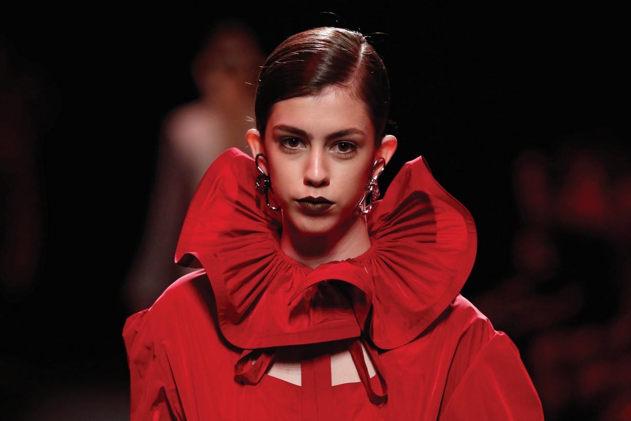Inspired by the figure of British writer Barbara Cartland, author of more than 600 love novels, Vidal presents creations that generate sensory emotions. The teddy bear becomes the collection’s key element, its cuddliness and candour translates into enveloping coats with furry buttons that incite to be caressed, delicious tailoring garments in chocolate tones, and delicate silk satin dresses topped with untied bows.