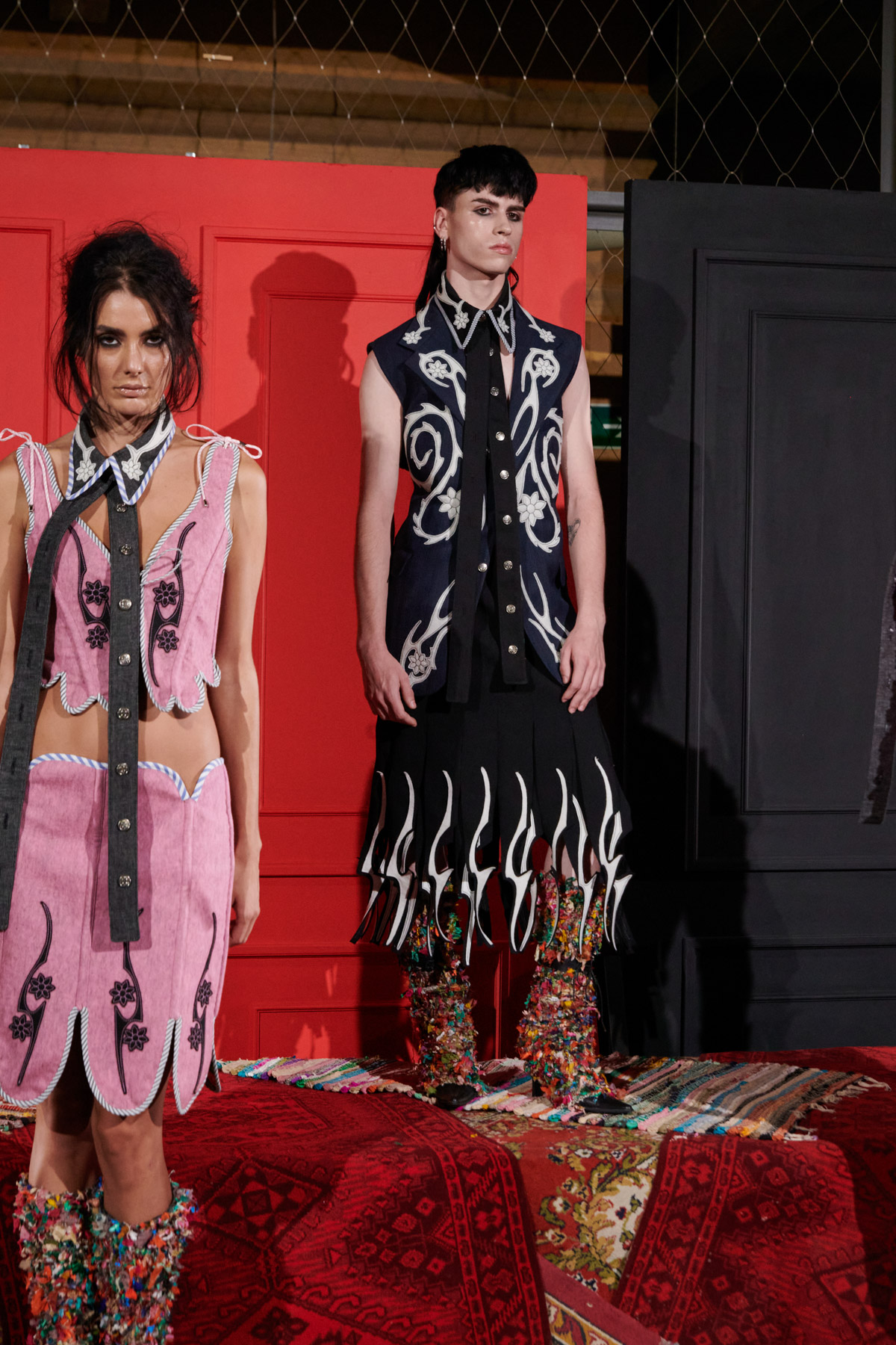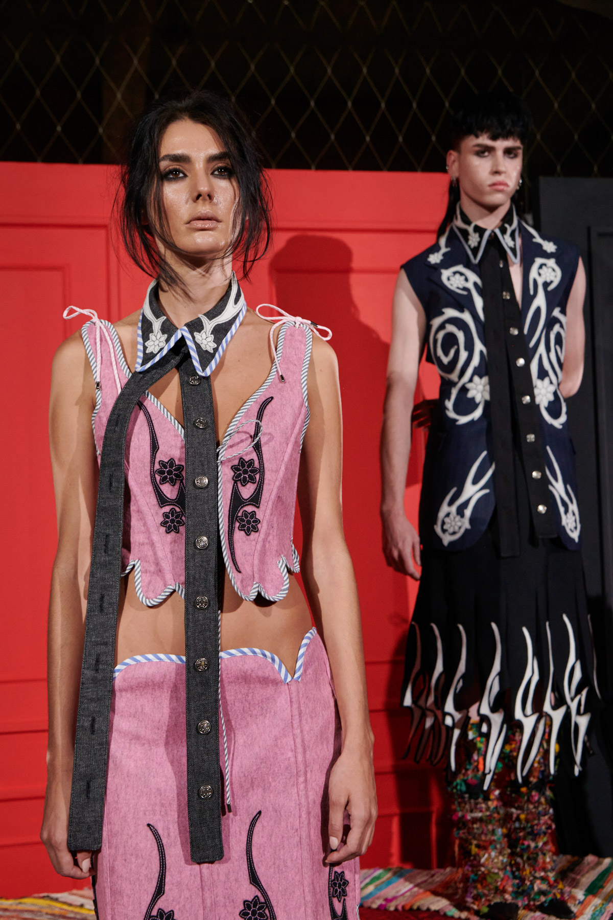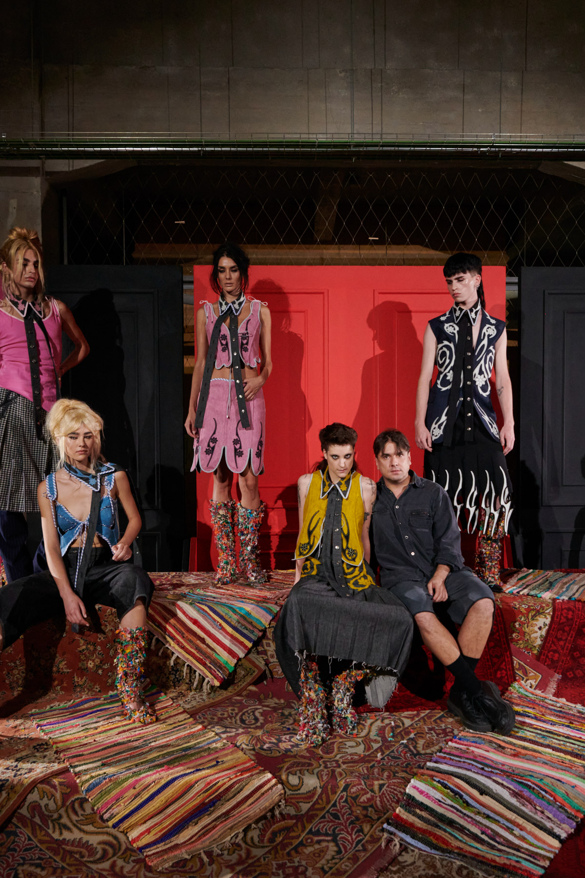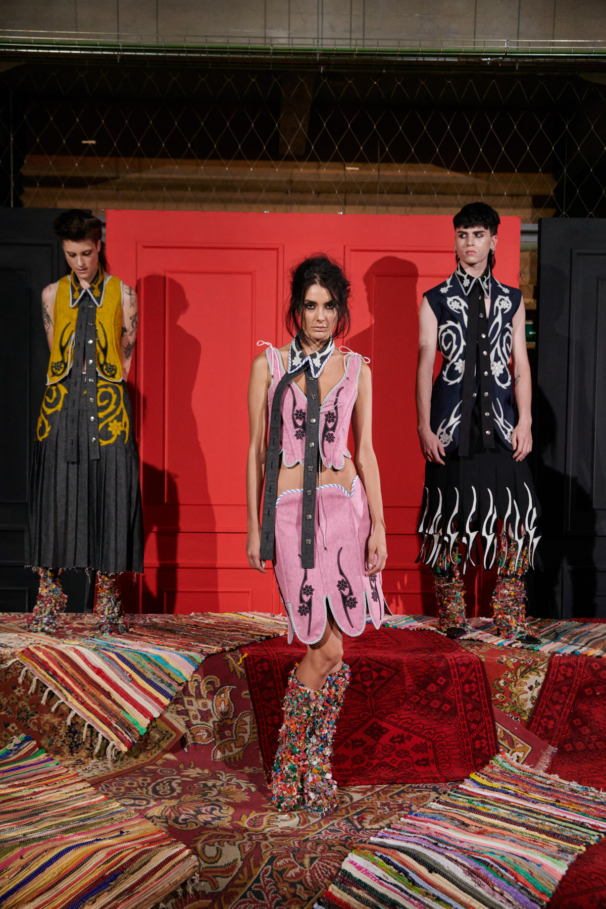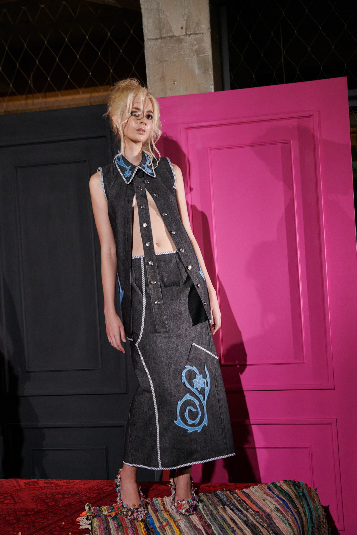 The designer is committed to recovering techniques for making regional costumes from Extremadura and La Mancha, such as “el picado”, a superposition of woollen fabrics made in Spain that reveal floral ornaments. The intense and vibrant colors of these raw materials helps to discover a modern and contemporary approach to folklore.