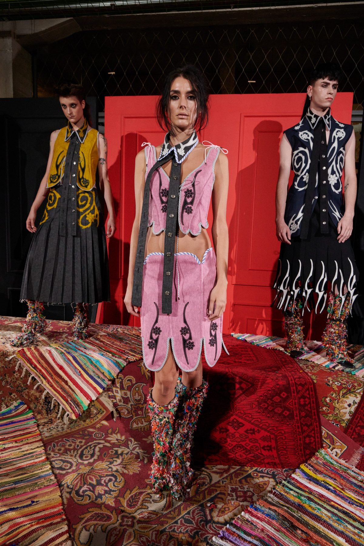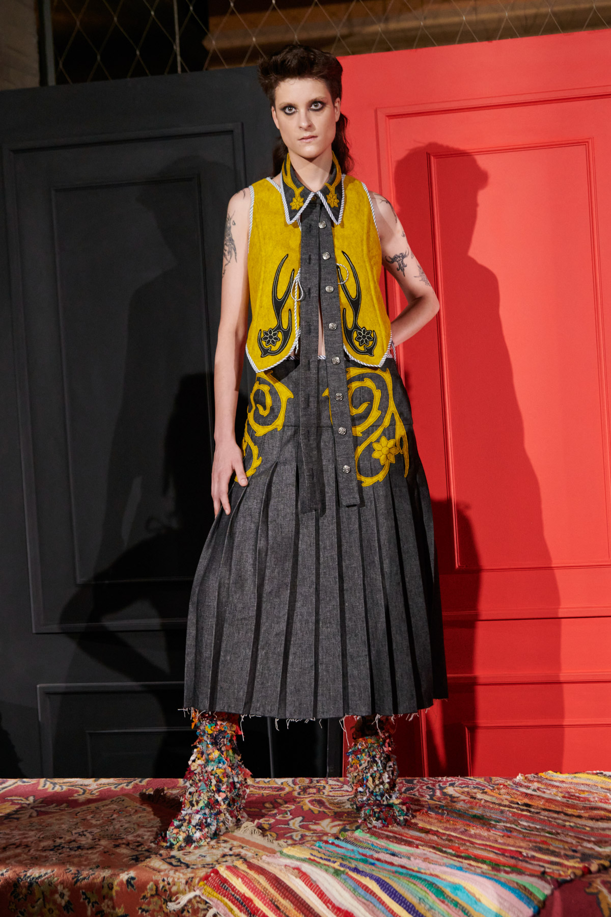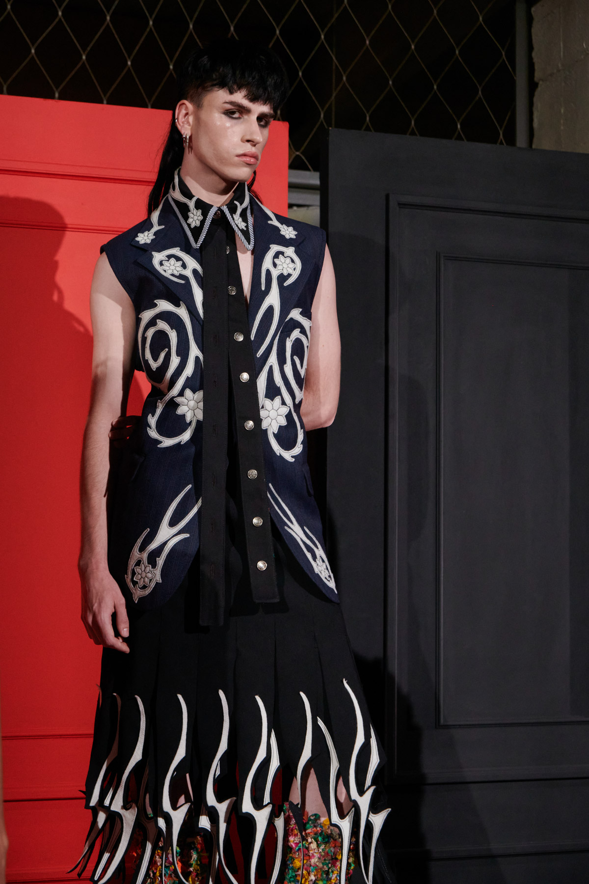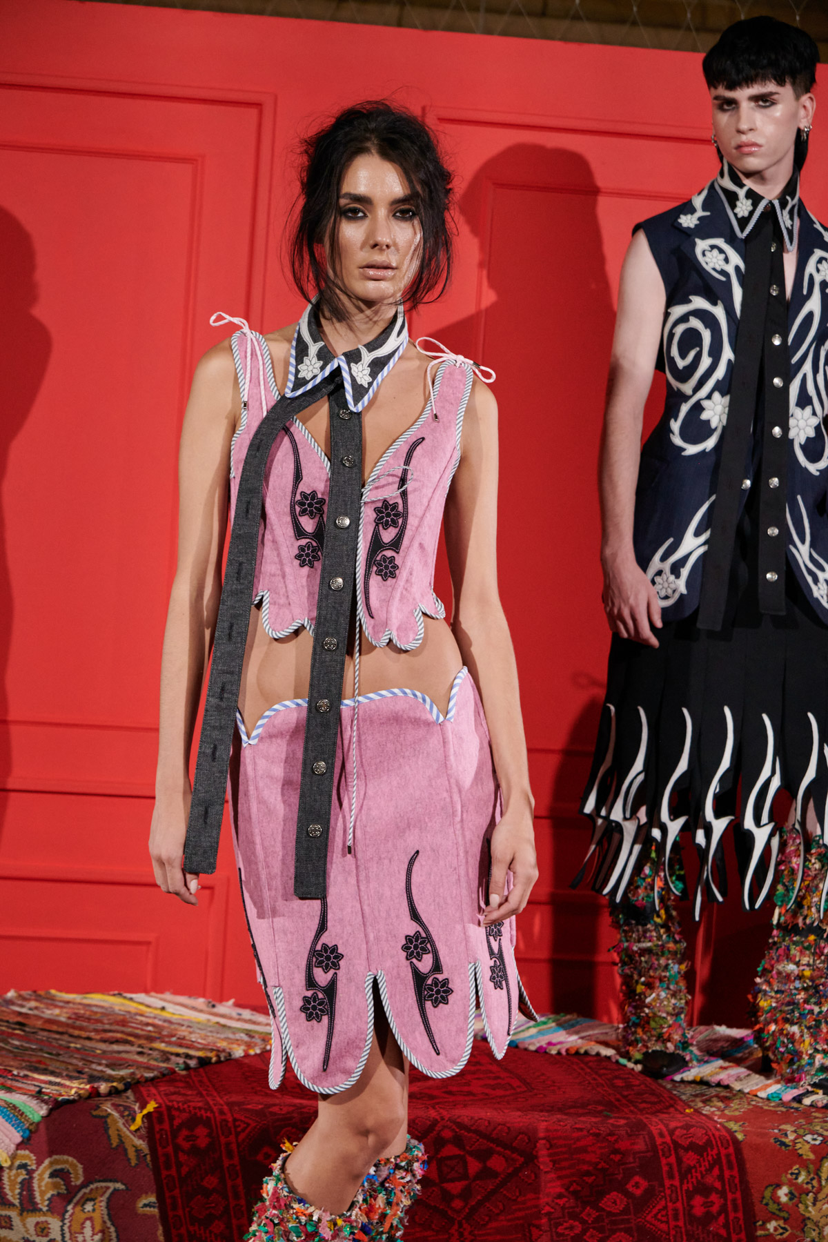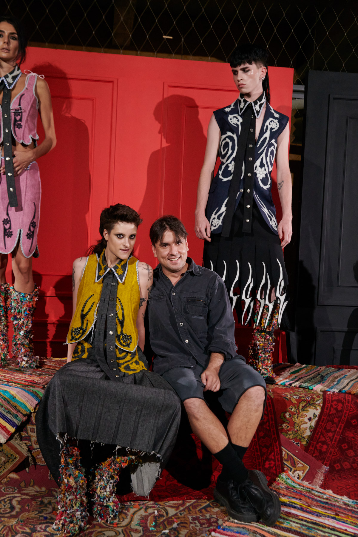 The designer is committed to recovering techniques for making regional costumes from Extremadura and La Mancha, such as “el picado”, a superposition of woollen fabrics made in Spain that reveal floral ornaments. The intense and vibrant colors of these raw materials helps to discover a modern and contemporary approach to folklore.