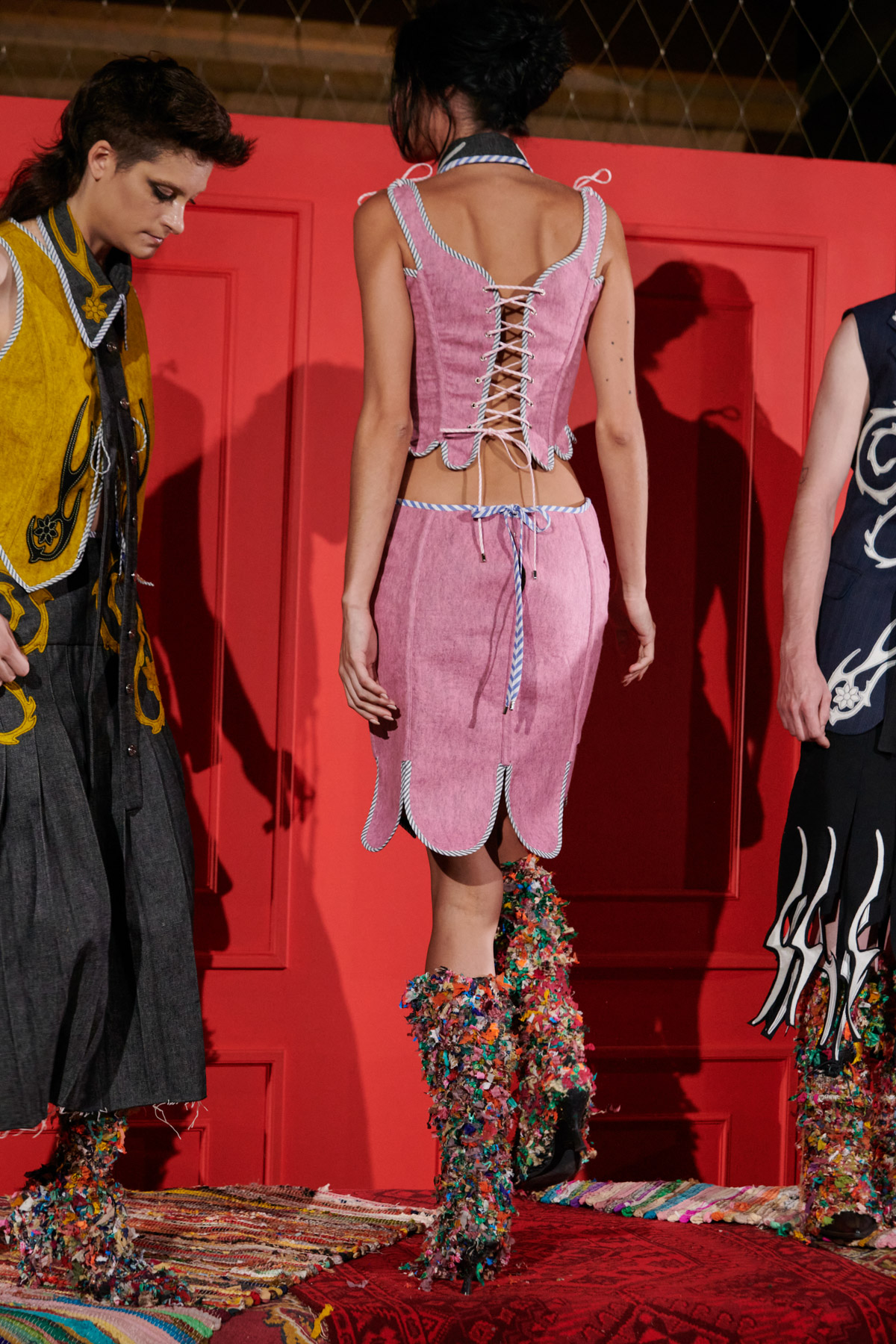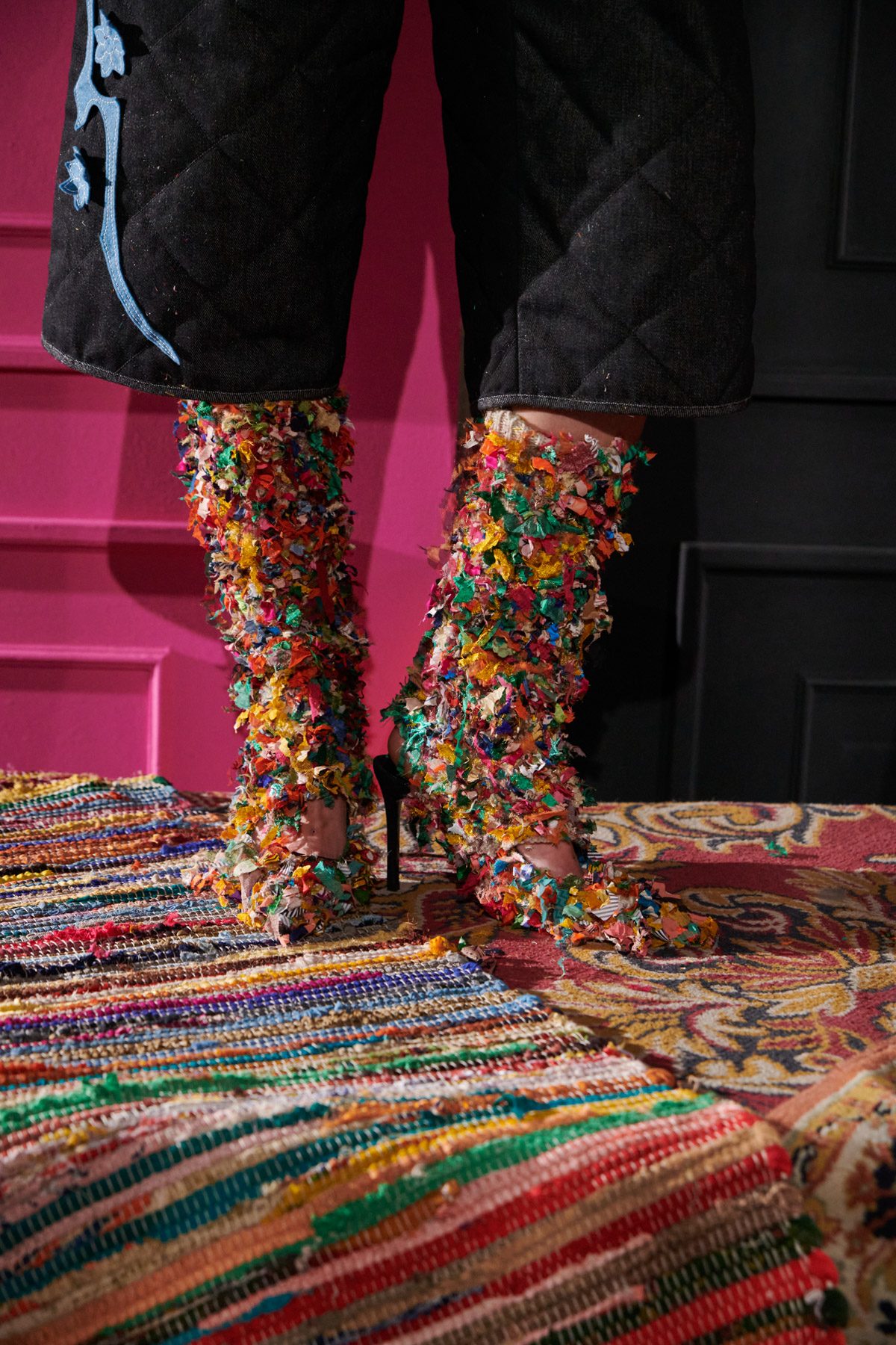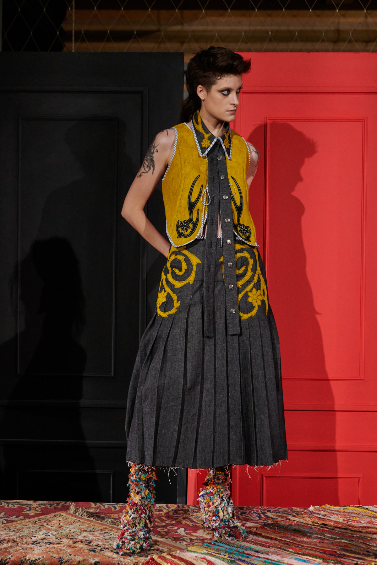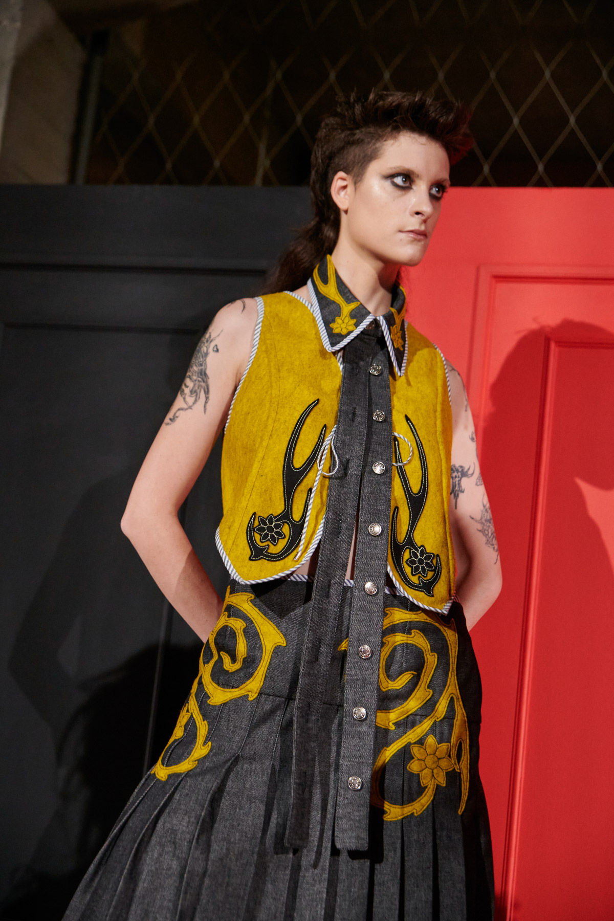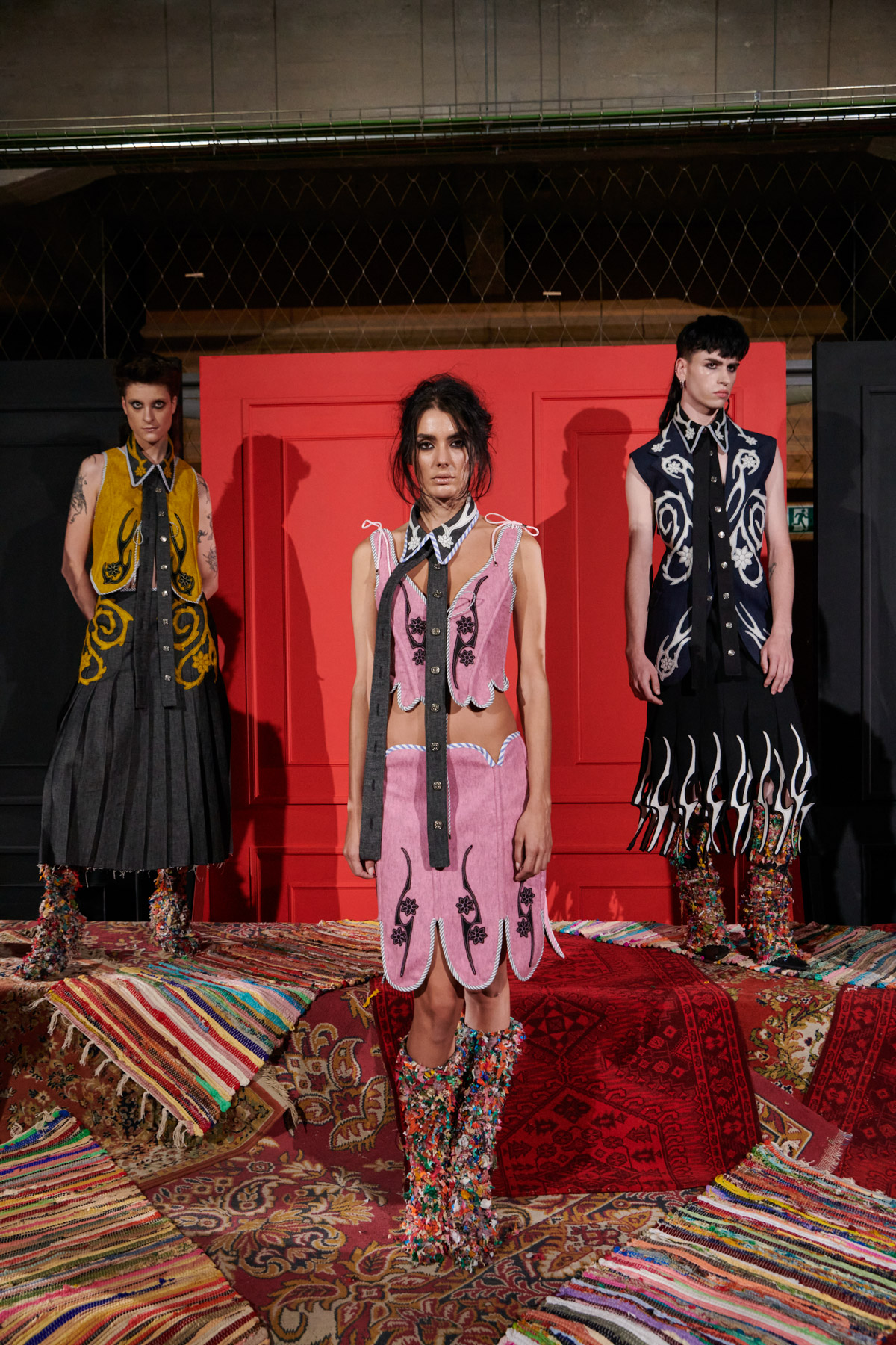 The designer is committed to recovering techniques for making regional costumes from Extremadura and La Mancha, such as “el picado”, a superposition of woollen fabrics made in Spain that reveal floral ornaments. The intense and vibrant colors of these raw materials helps to discover a modern and contemporary approach to folklore.
