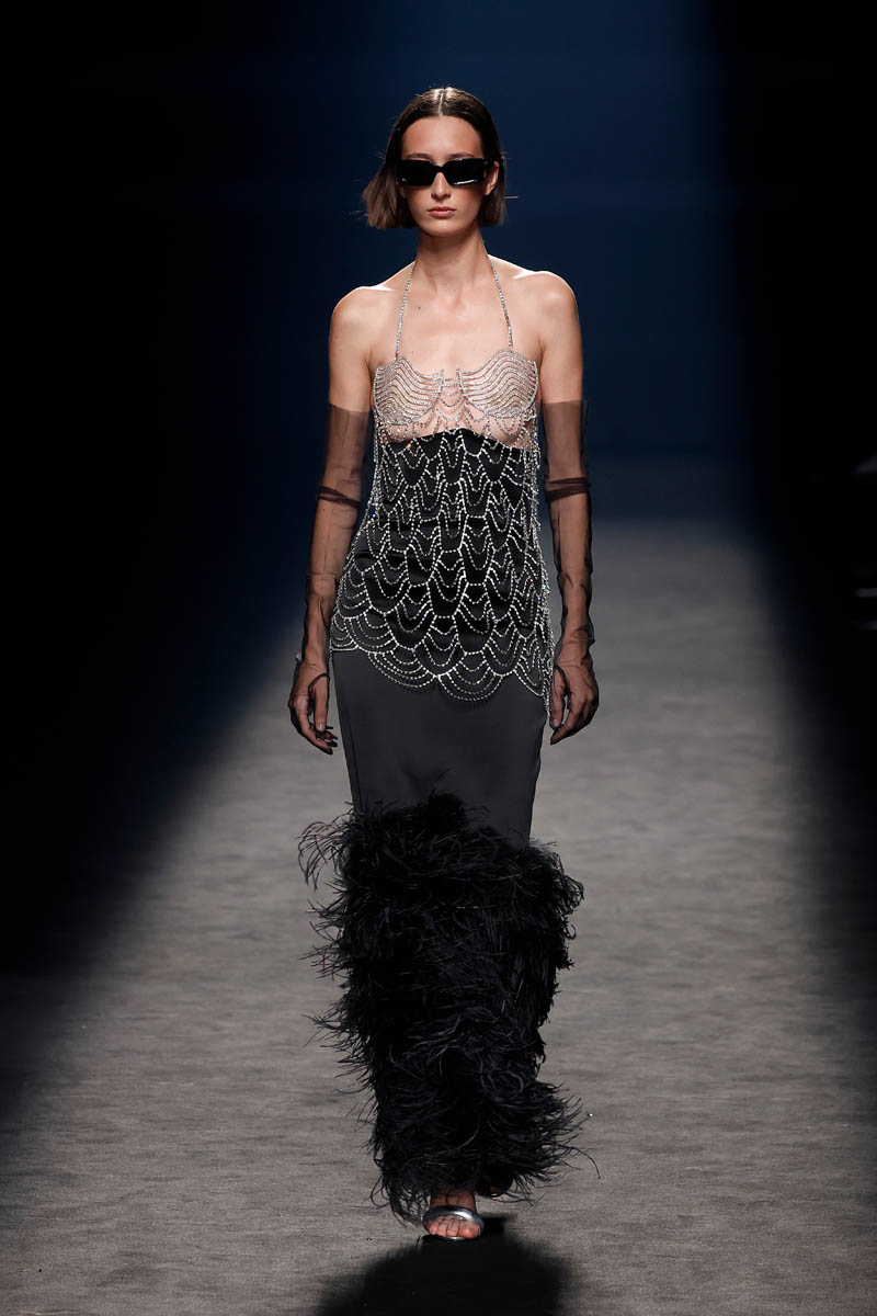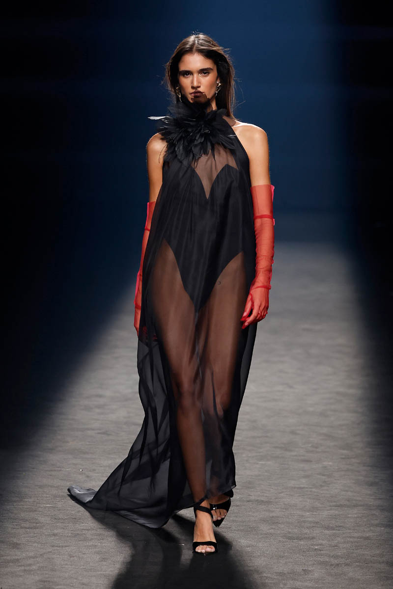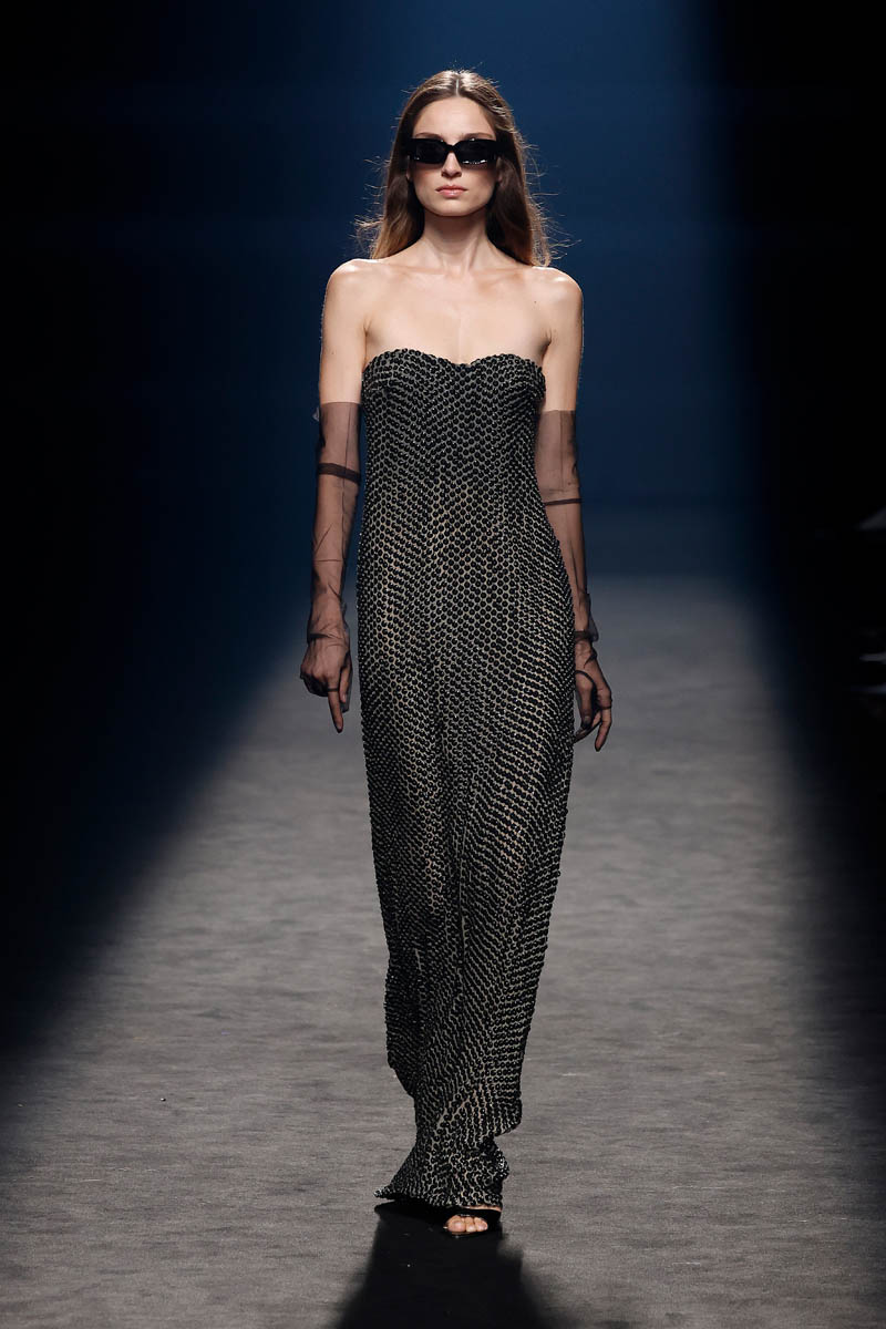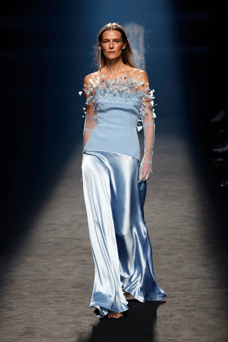 The Sevillian house, directed by Fernando Claro and his daughter Beatriz, performs a couture exercise on the catwalk with meticulously crafted creations in their atelier in Dos Hermanas, Andalucia. The female silhouette is shown freely, with patterns that detach from the body or transparencies that show it openly.