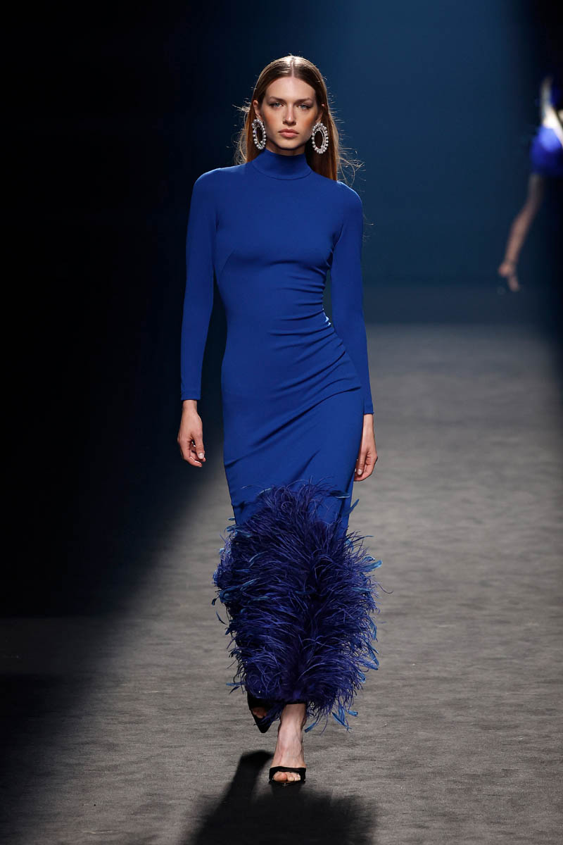 Claro Couture proposes a collection that blends fabrics and textures. Very powerful looks in which different shades of blue, and black, stand out as key colors. There is also room for fuchsia pink, showcased in designs with floral applications. The star materials being satin, chiffon, fabrics full of sequins and lace dotted with feathers.