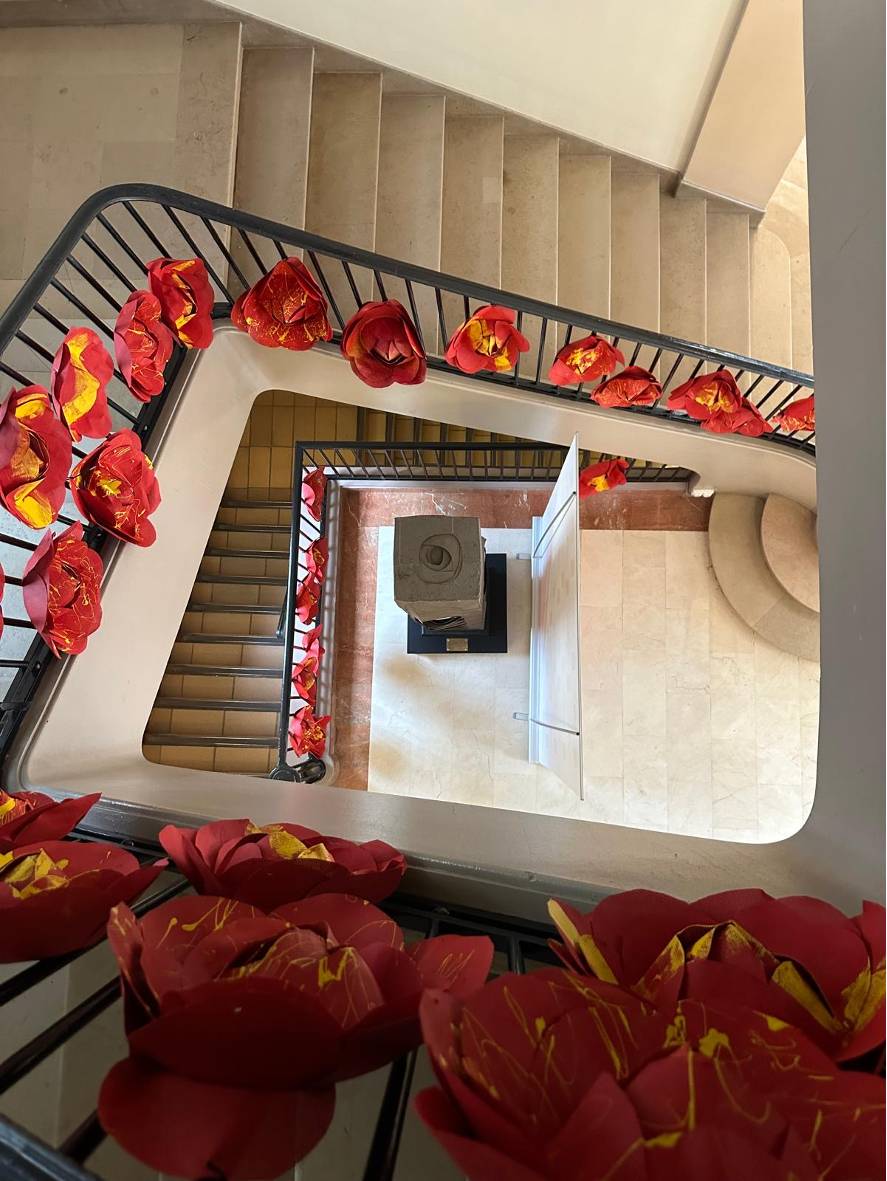 The Asturian-Leonese fashion designer María Lafuente has been present in Paris, not as an athlete, of course, but through her designs. On this occasion, she has dressed up the staircase of María Lafuente,, the venue for the Spanish Olympic family in the City of Light, with color and joy, and has made Spain shine with a magnificent garden of sustainable flowers in the Spanish flag’s colors.