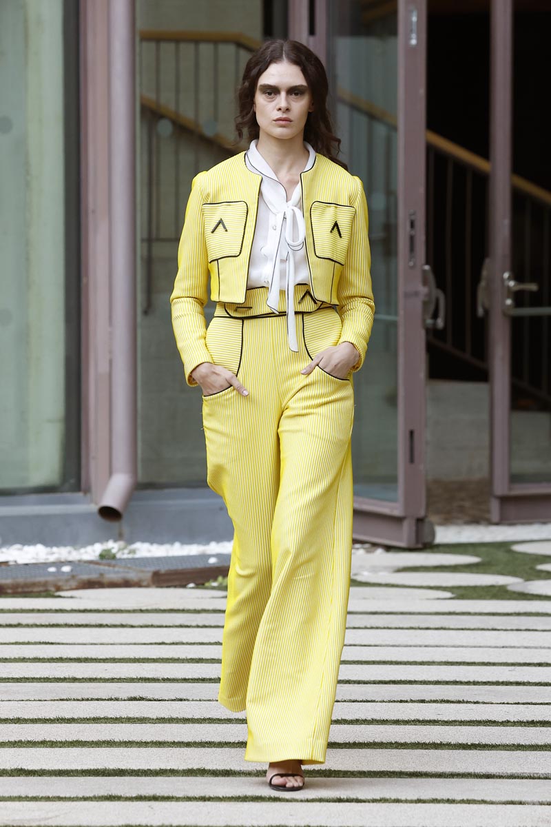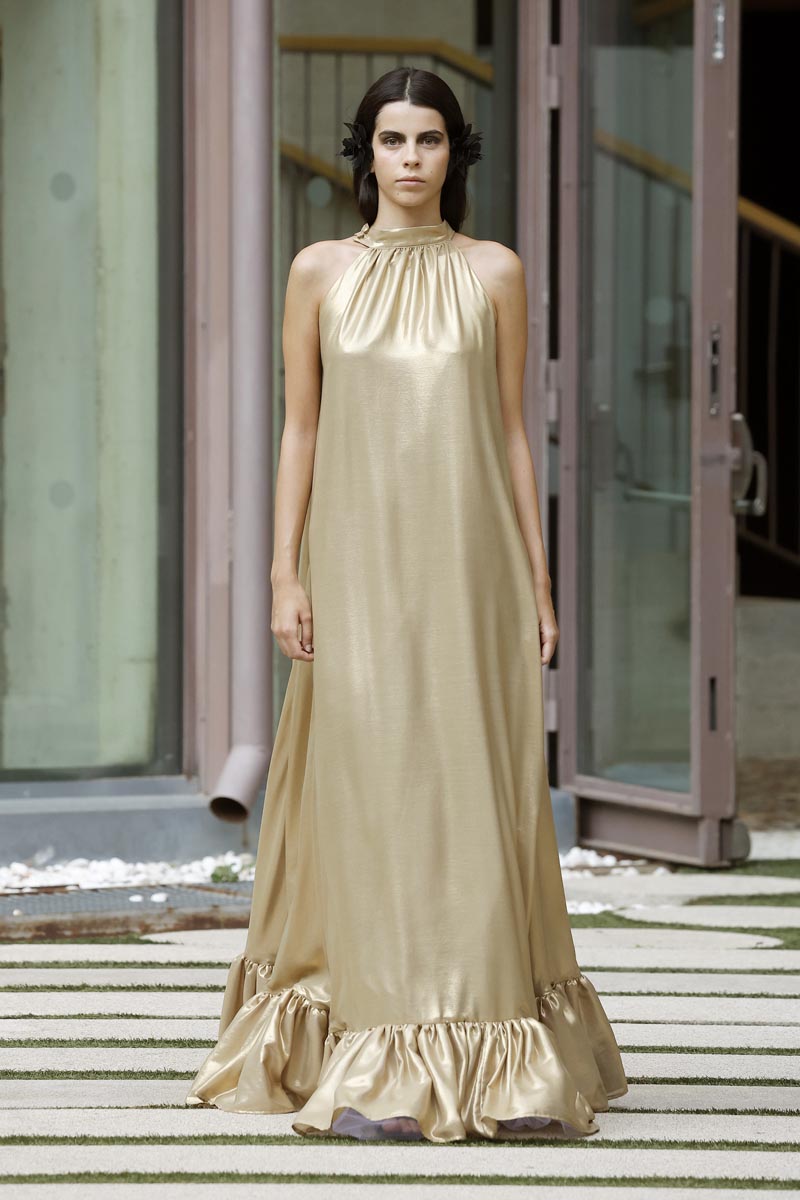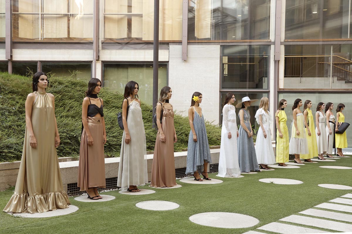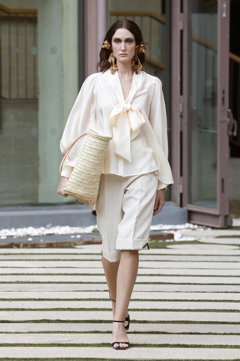 The fashion creator presents a collection with controlled volumes, fitted lines and fluid skirts where the color palette, bright yellow, green tones and metallic nuances, reflect the chromatic diversity of the riverbed’s protected natural landscape. Combined fabrics, from methacrylate to tweed, linen and airy gauze, give a fresh and renewed vision while maintaining the fashion brand’s essence.