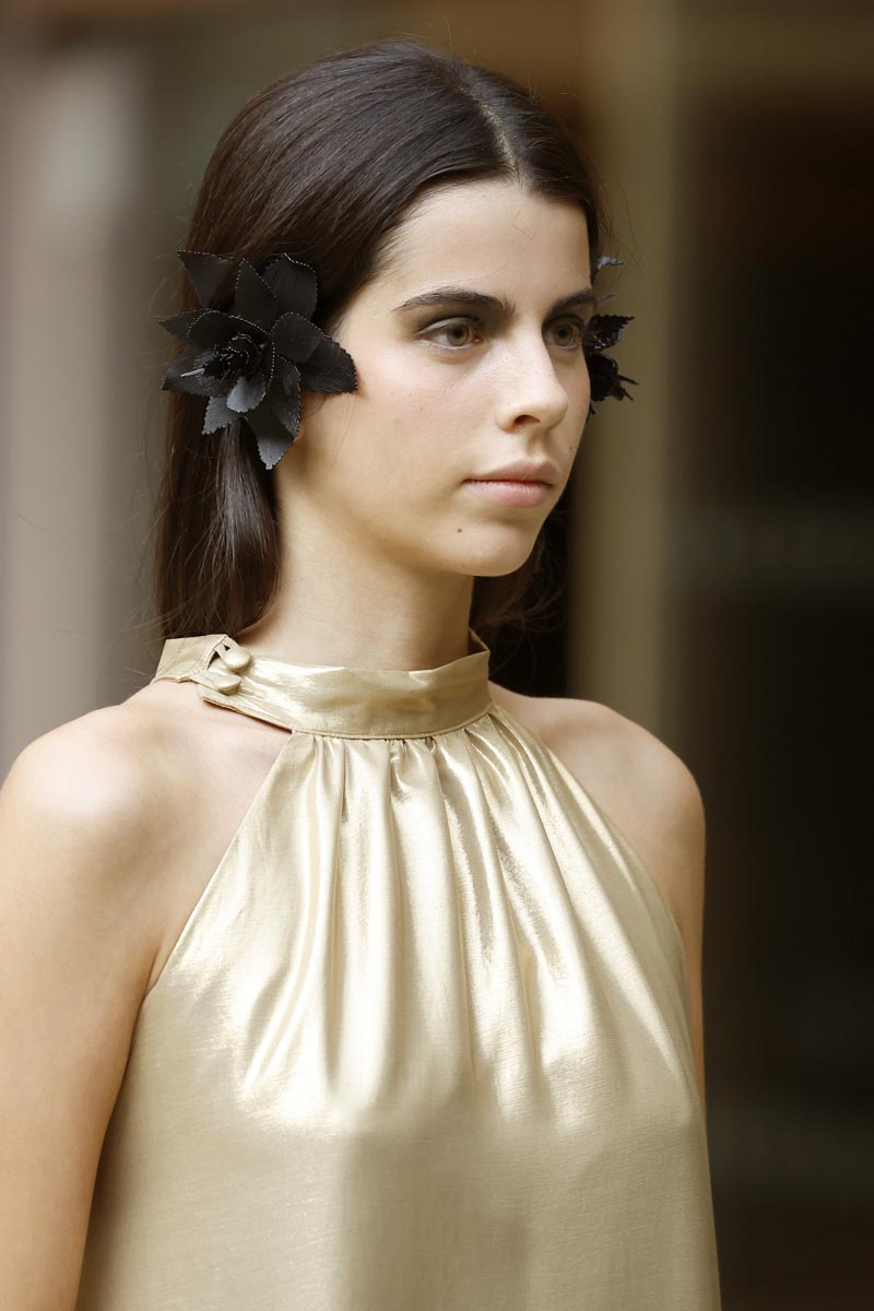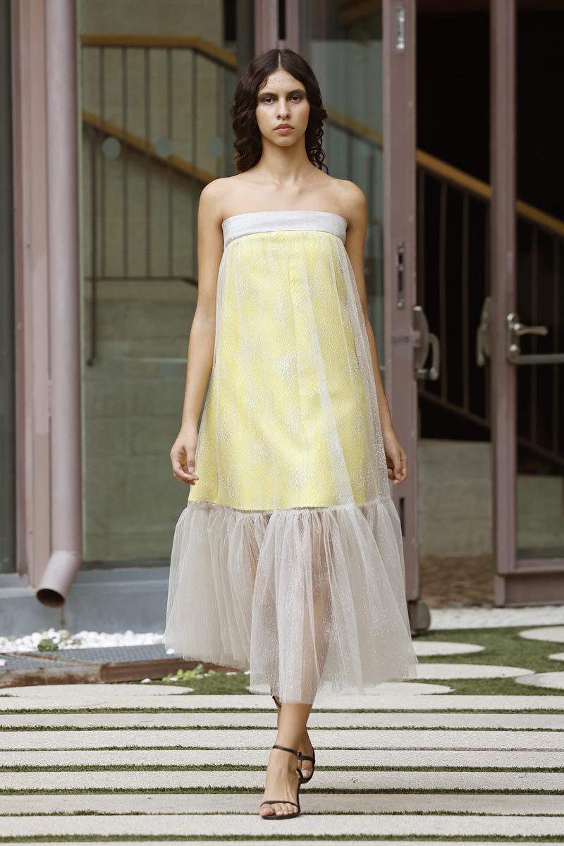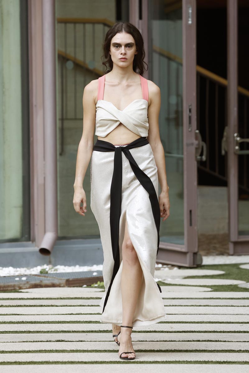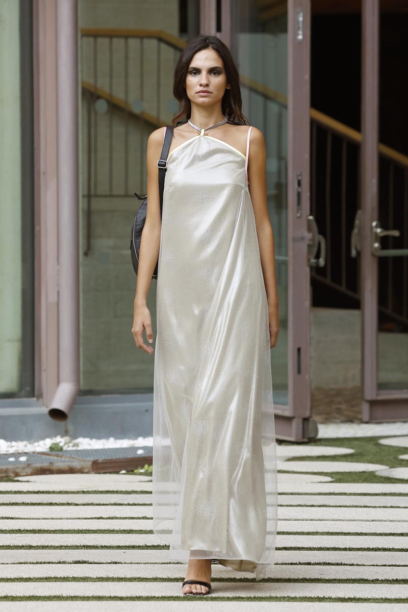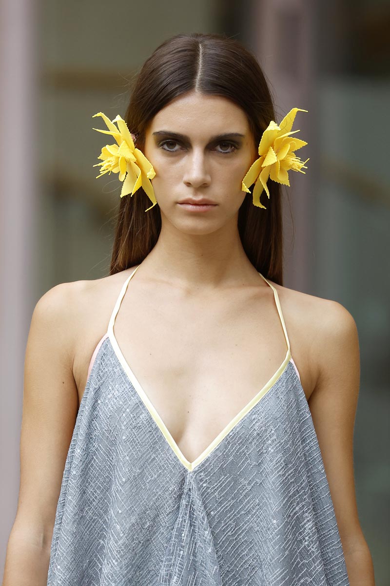 The fashion creator presents a collection with controlled volumes, fitted lines and fluid skirts where the color palette, bright yellow, green tones and metallic nuances, reflect the chromatic diversity of the riverbed’s protected natural landscape. Combined fabrics, from methacrylate to tweed, linen and airy gauze, give a fresh and renewed vision while maintaining the fashion brand’s essence.