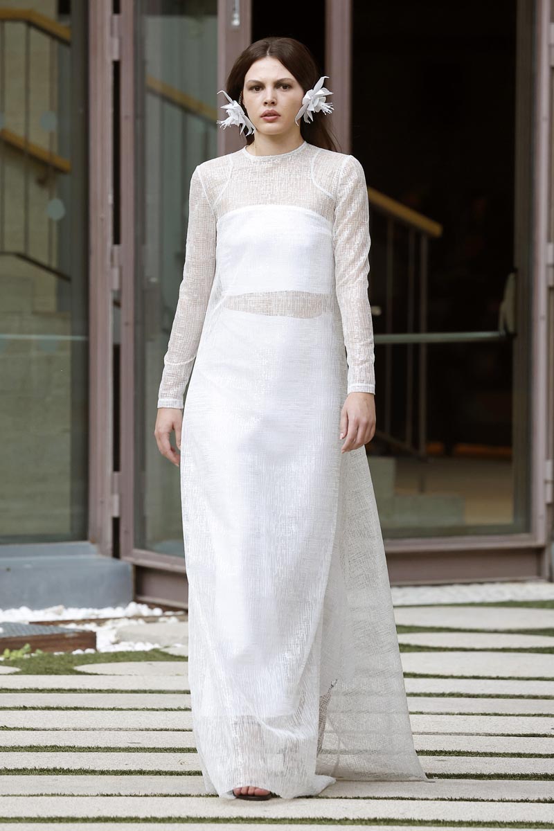 Vests and peaks, icons of the brand, have reappeared in her designs with transparencies and new textures, which make up most of the spring line of the collection. As a commitment to the environment and responsible fashion, Pilar Dalbat has collaborated with Héctor Lara, who has developed the jewellery using 3D printing and sustainable filaments composed of recycled wood and PLA biodegradable polymer.