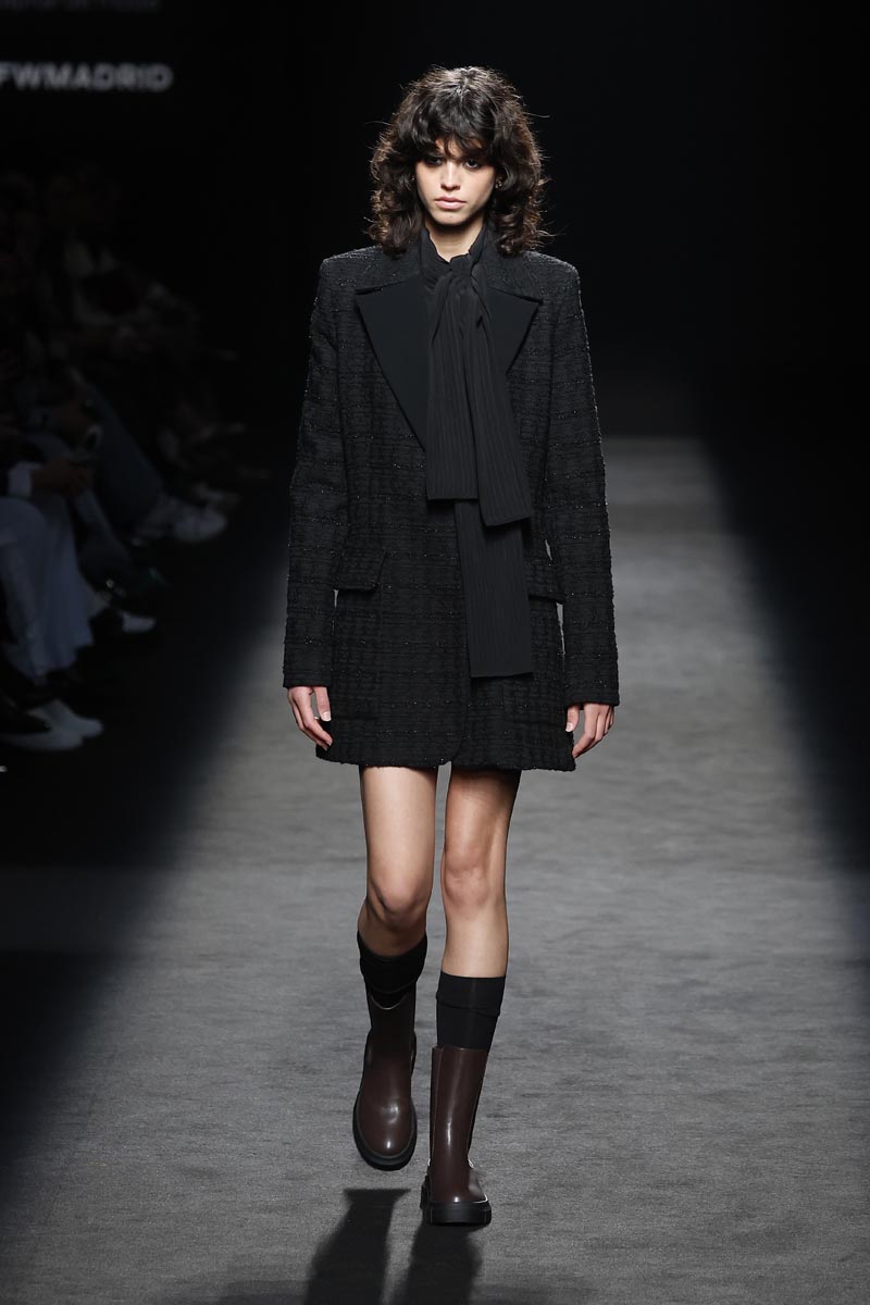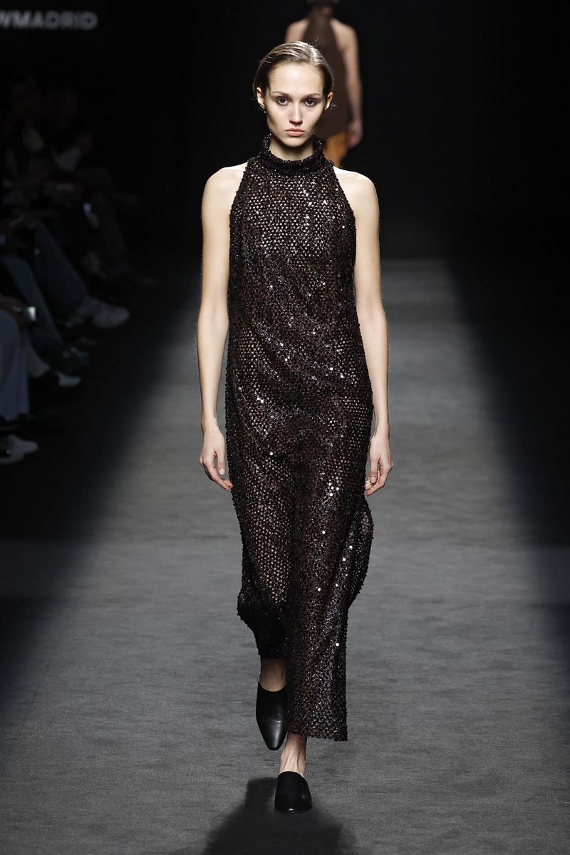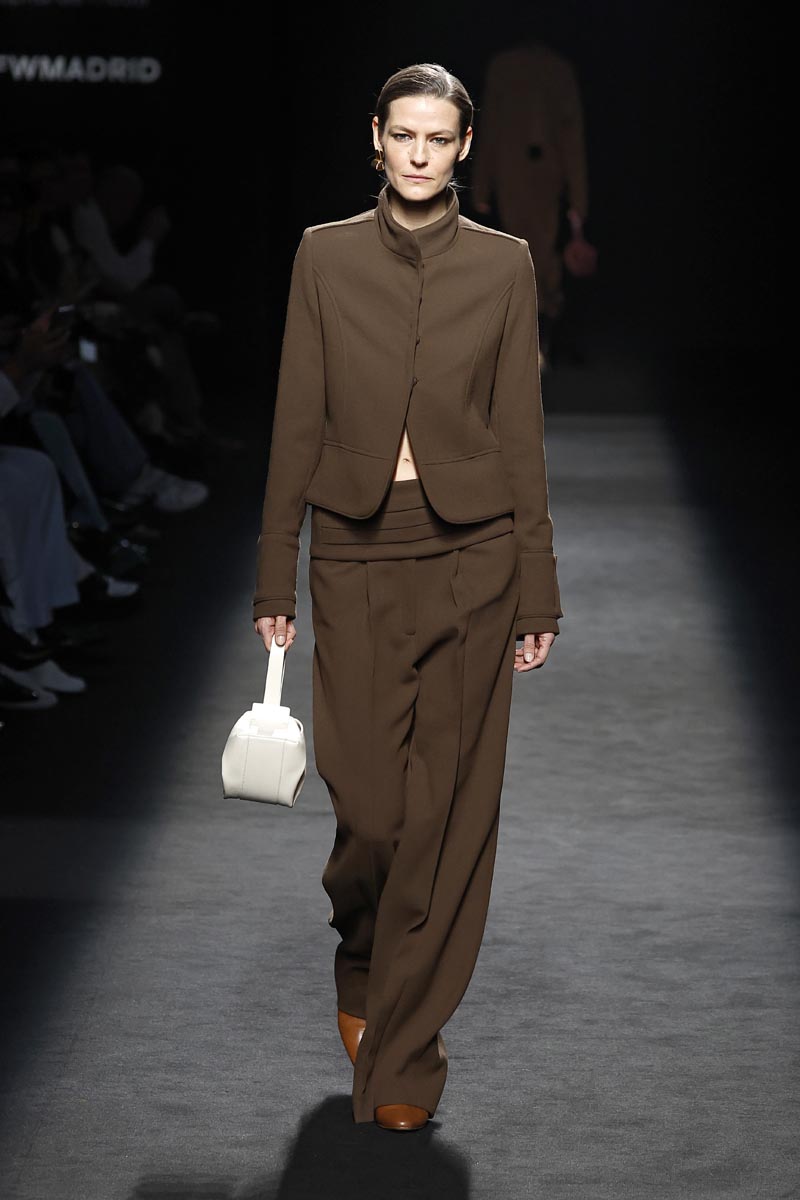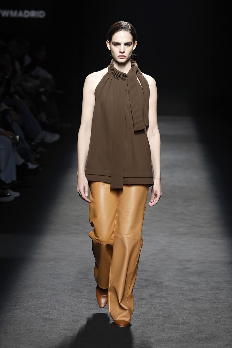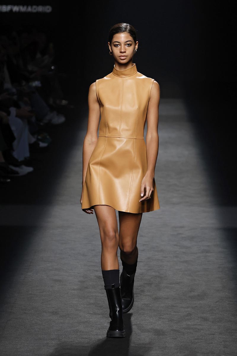 The hourglass silhouette dominates the collection, with mini dresses, plunging necklines and obvious seaming. Napa leather appears in cappuccino color in different looks, as a dress, as a skirt, as trousers and even as a coat. Likewise, the creator proposes fluid dresses in coral tone that engage with the female body. For the evening, he makes a reinterpretation of the tuxedo in cold wool fabrics with textures and paillettes in chocolate tone.