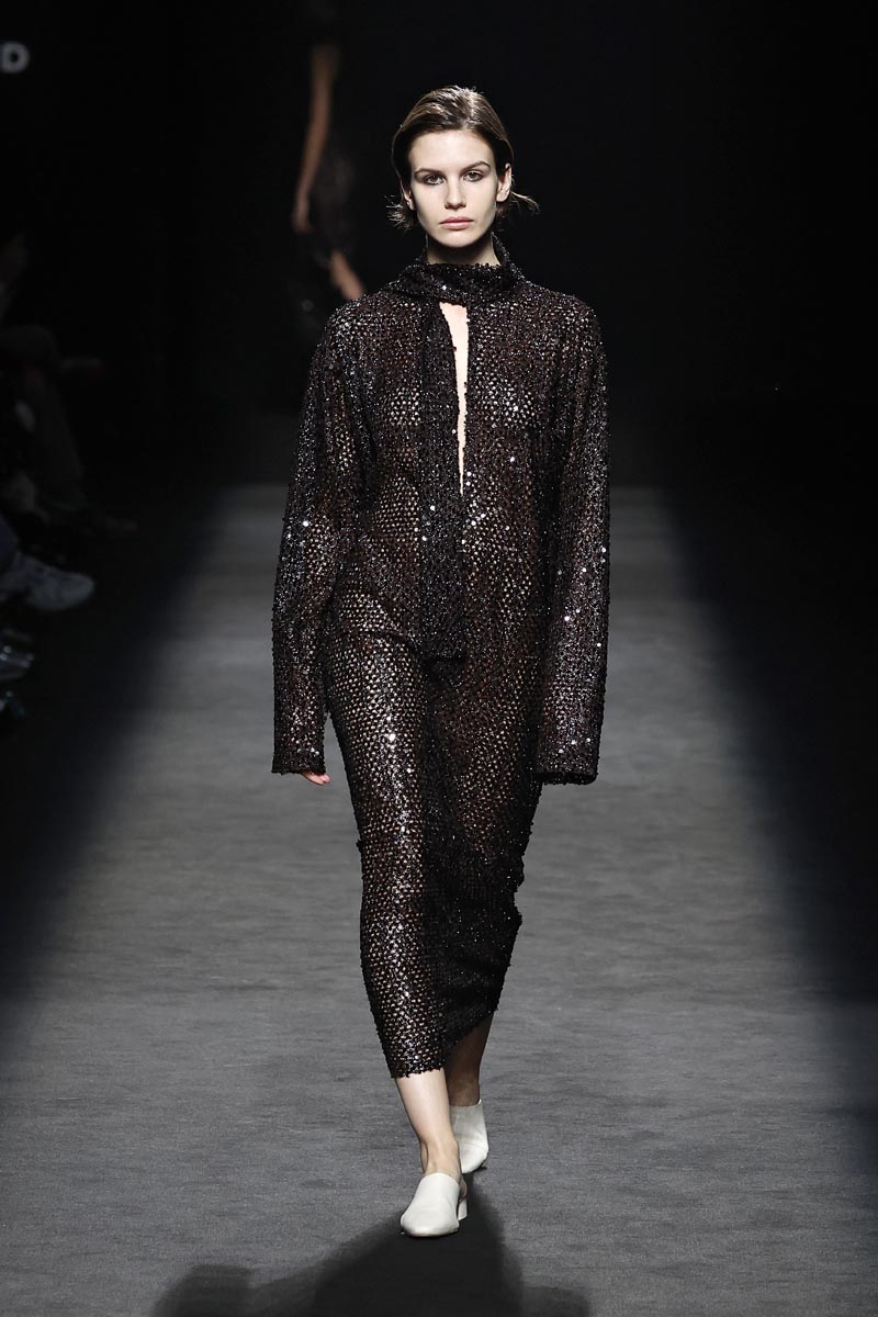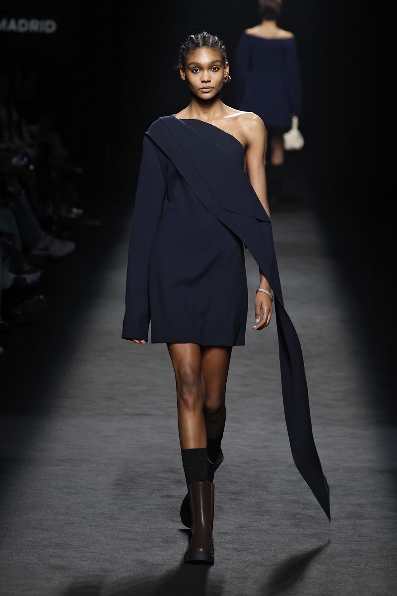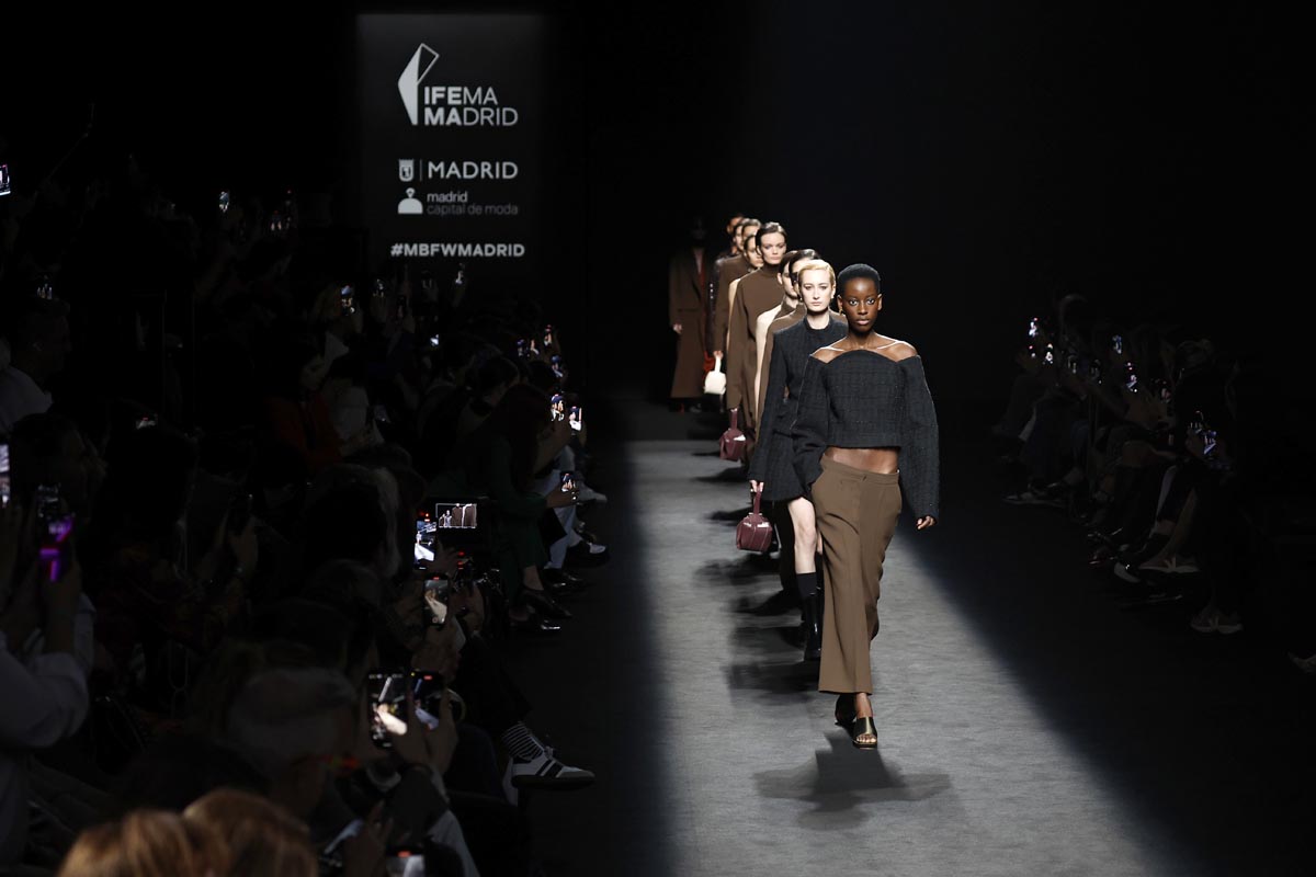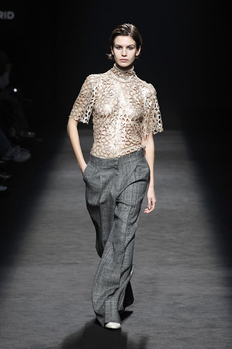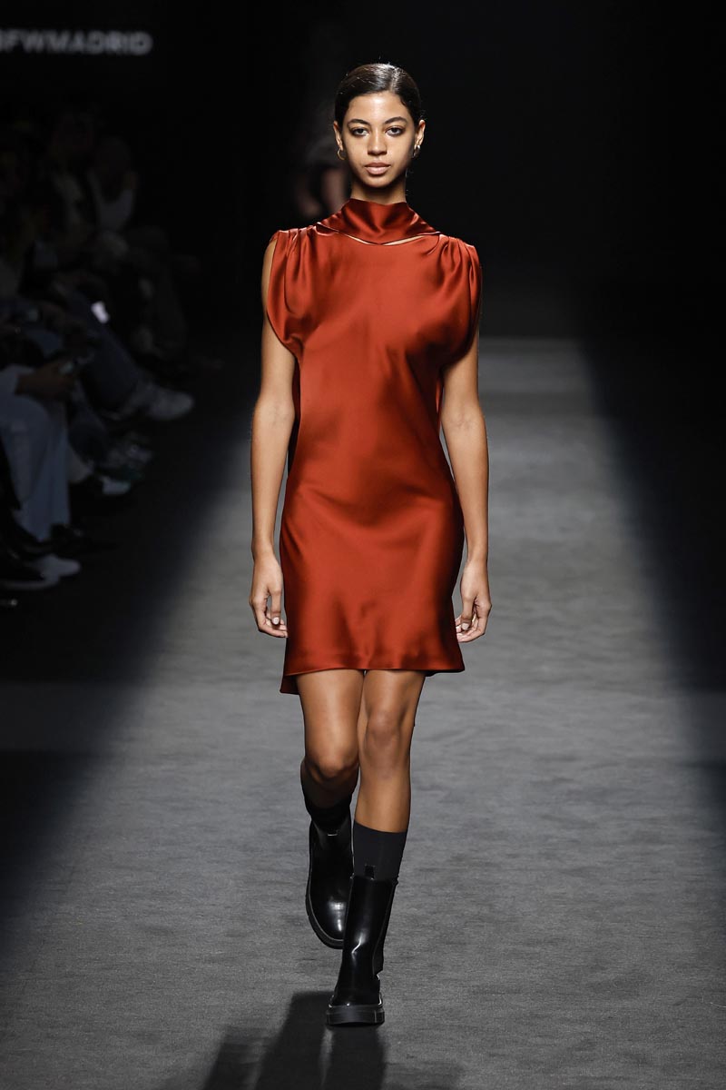 The hourglass silhouette dominates the collection, with mini dresses, plunging necklines and obvious seaming. Napa leather appears in cappuccino color in different looks, as a dress, as a skirt, as trousers and even as a coat. Likewise, the creator proposes fluid dresses in coral tone that engage with the female body. For the evening, he makes a reinterpretation of the tuxedo in cold wool fabrics with textures and paillettes in chocolate tone.