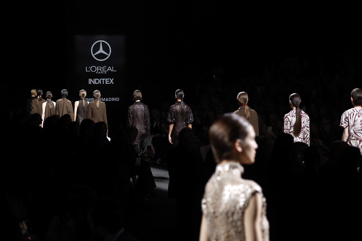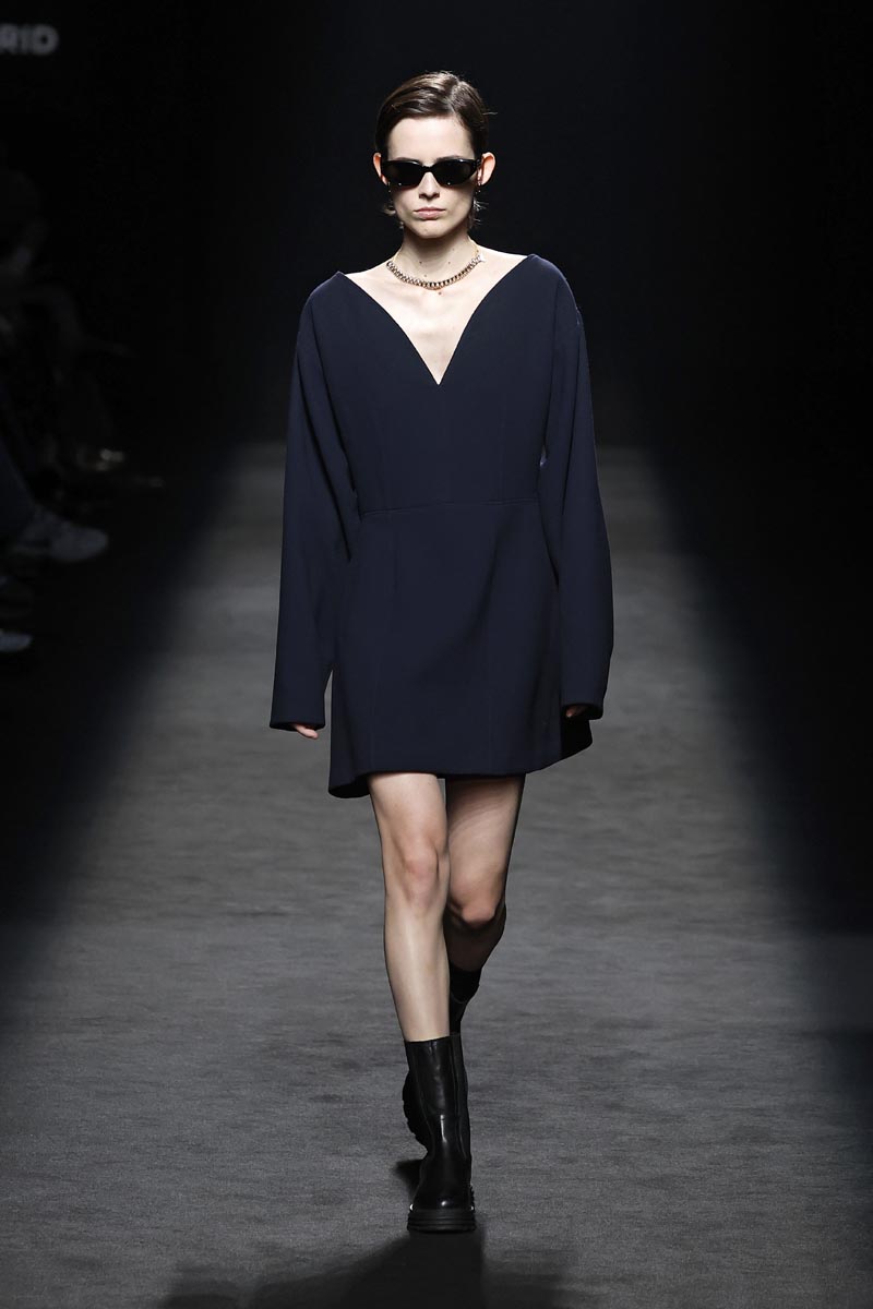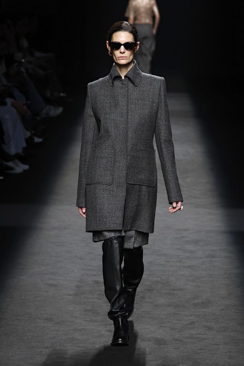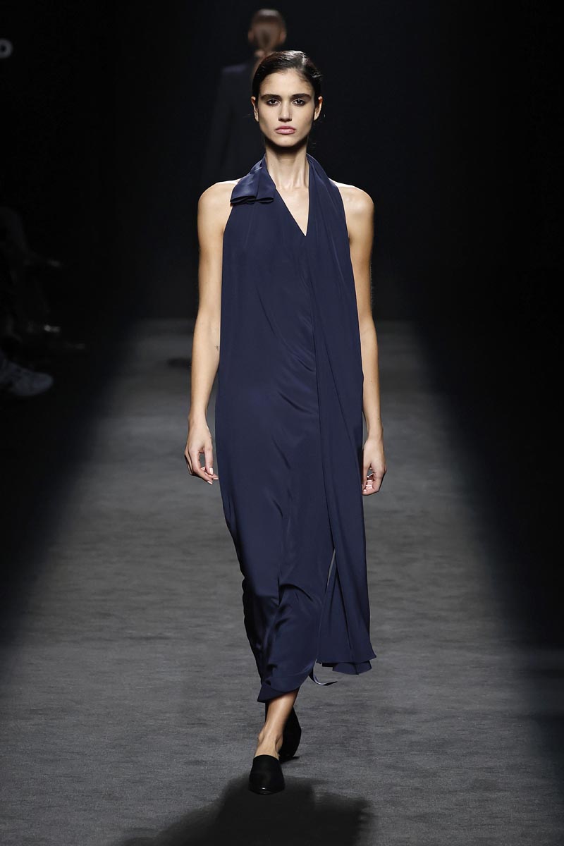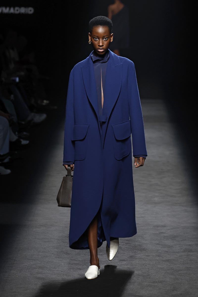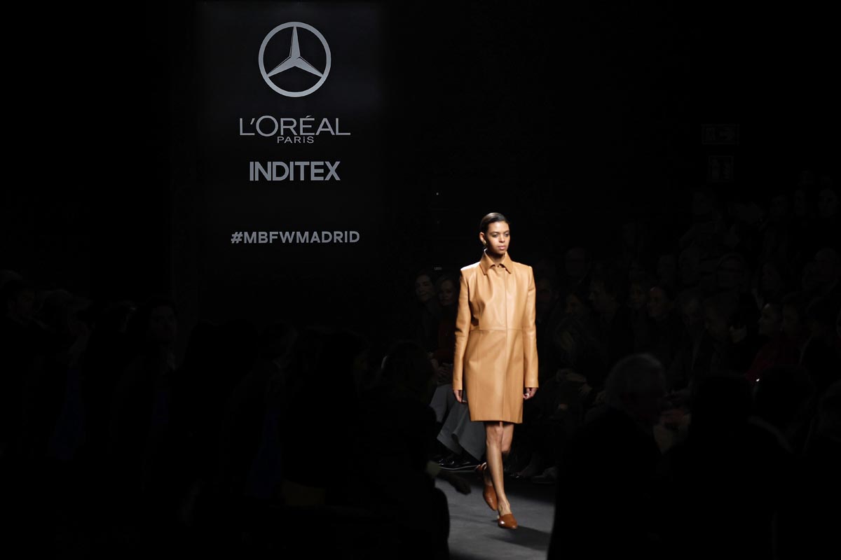 The hourglass silhouette dominates the collection, with mini dresses, plunging necklines and obvious seaming. Napa leather appears in cappuccino color in different looks, as a dress, as a skirt, as trousers and even as a coat. Likewise, the creator proposes fluid dresses in coral tone that engage with the female body. For the evening, he makes a reinterpretation of the tuxedo in cold wool fabrics with textures and paillettes in chocolate tone.