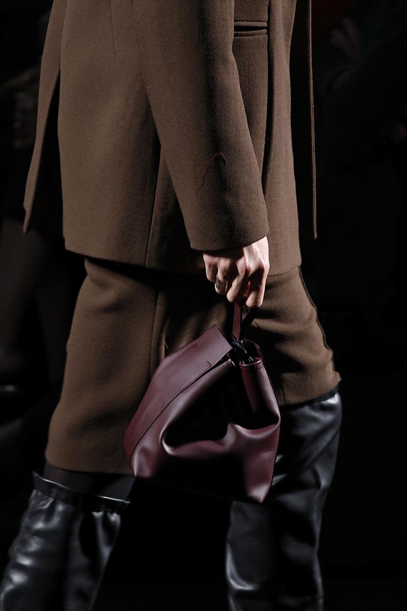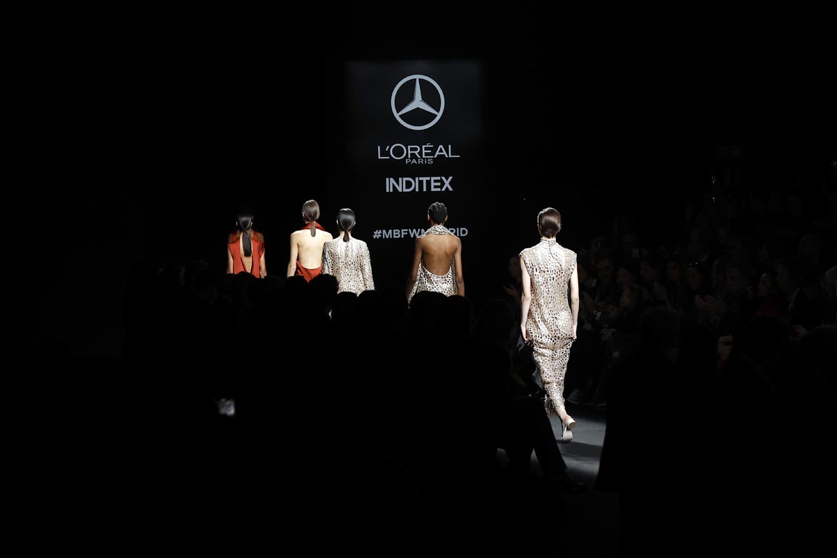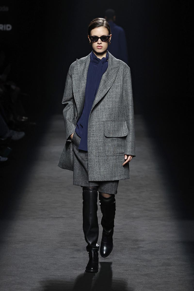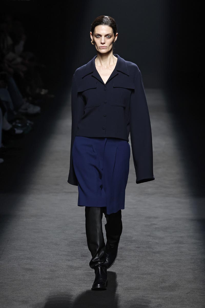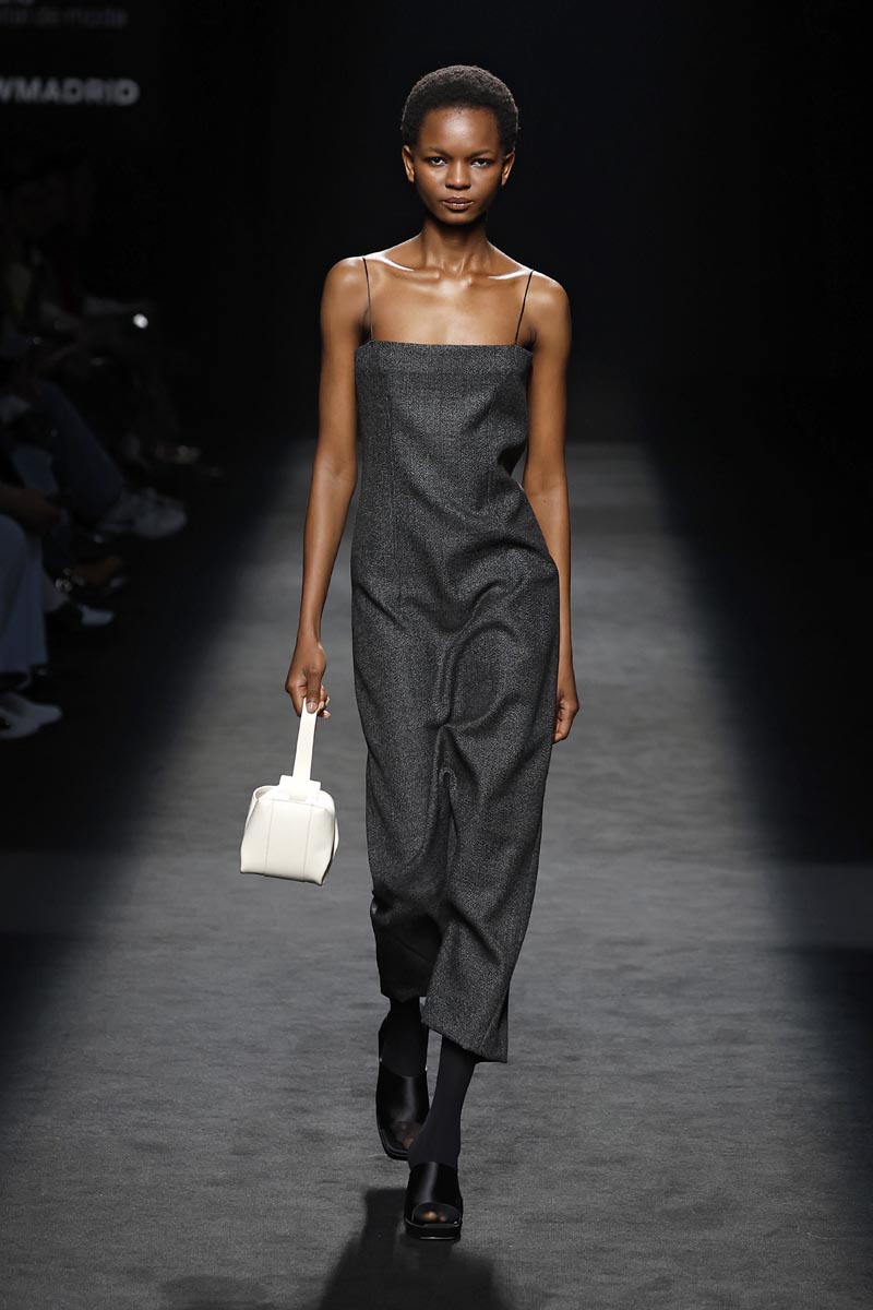 The hourglass silhouette dominates the collection, with mini dresses, plunging necklines and obvious seaming. Napa leather appears in cappuccino color in different looks, as a dress, as a skirt, as trousers and even as a coat. Likewise, the creator proposes fluid dresses in coral tone that engage with the female body. For the evening, he makes a reinterpretation of the tuxedo in cold wool fabrics with textures and paillettes in chocolate tone.