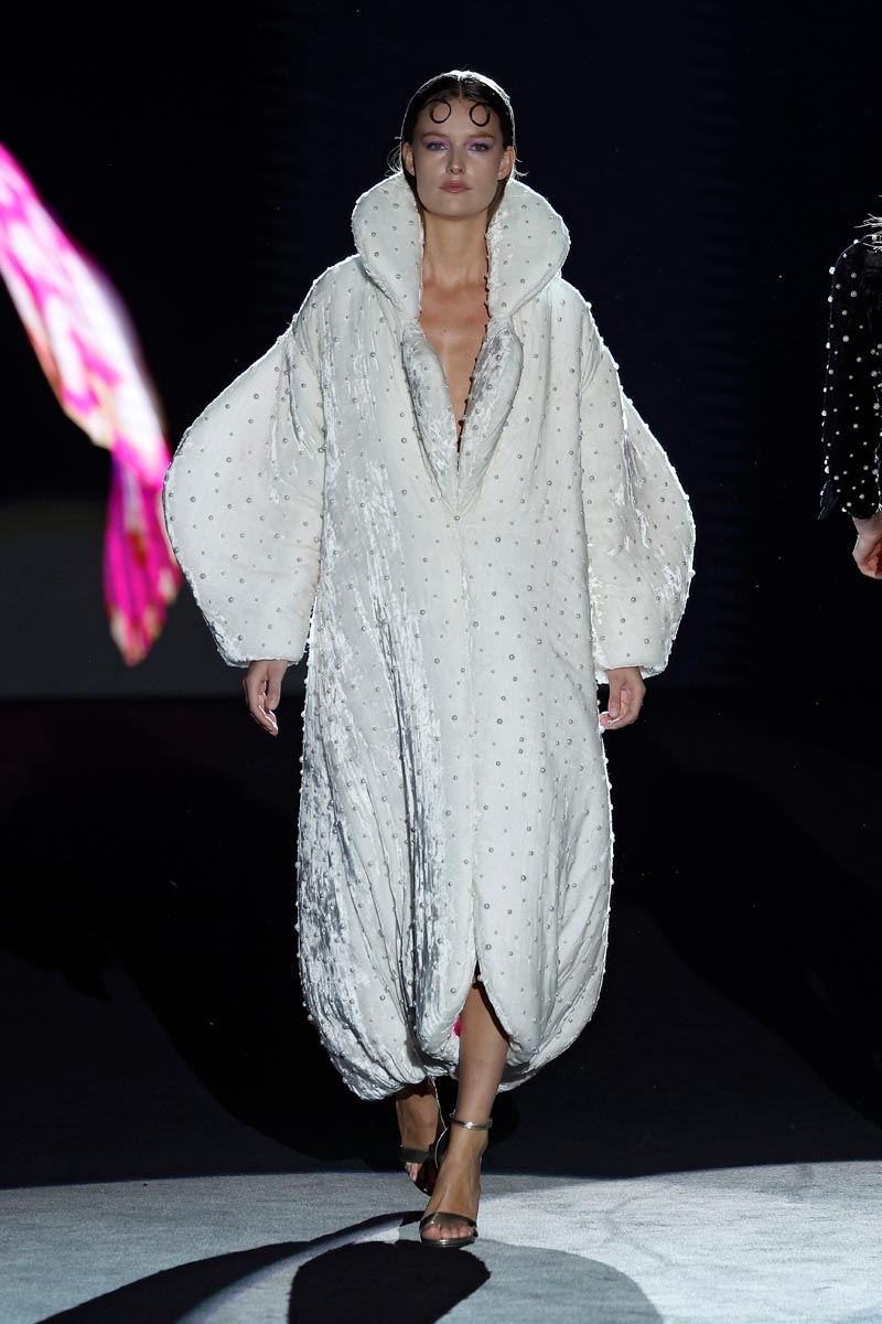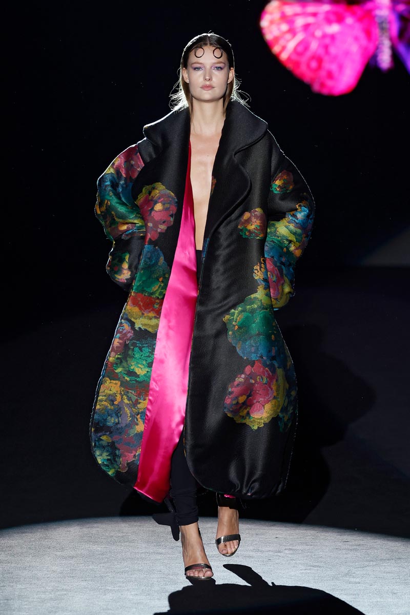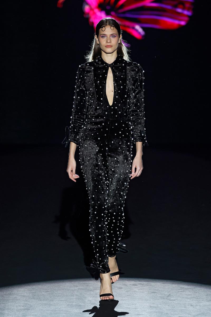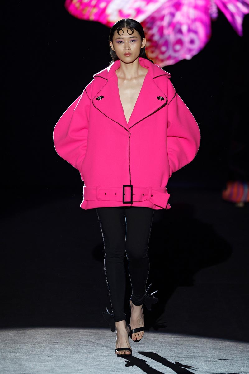 The fashion designer presents her iconic jewel coats that are construed with large volumes on the sleeves and flow down, to the floor. Long shirt dresses with ruffles on the sleeves and mega-short print dresses decorated with crystal details, Perfecto style jackets and beaded jumpsuits. Leggings, with a bow finished with butterfly-shaped pearls are the collection’s leitmotiv.