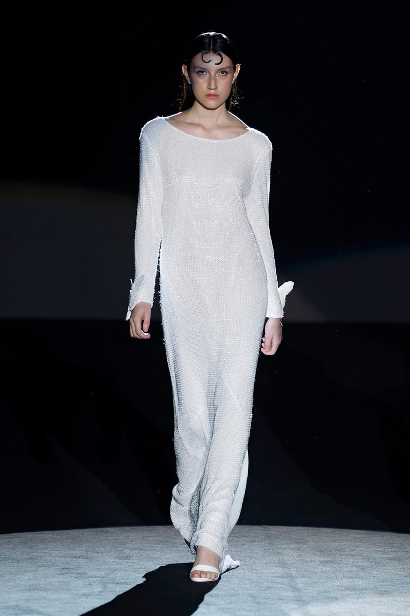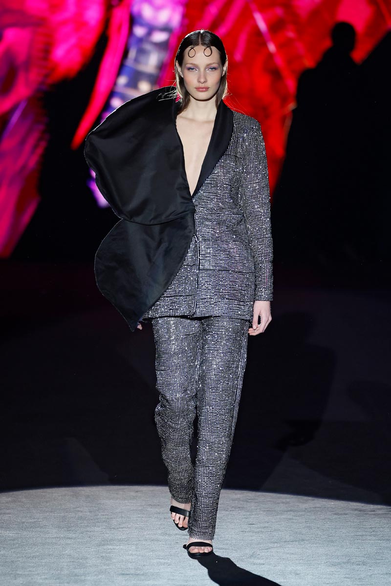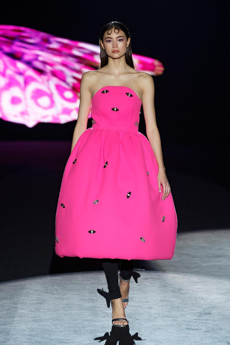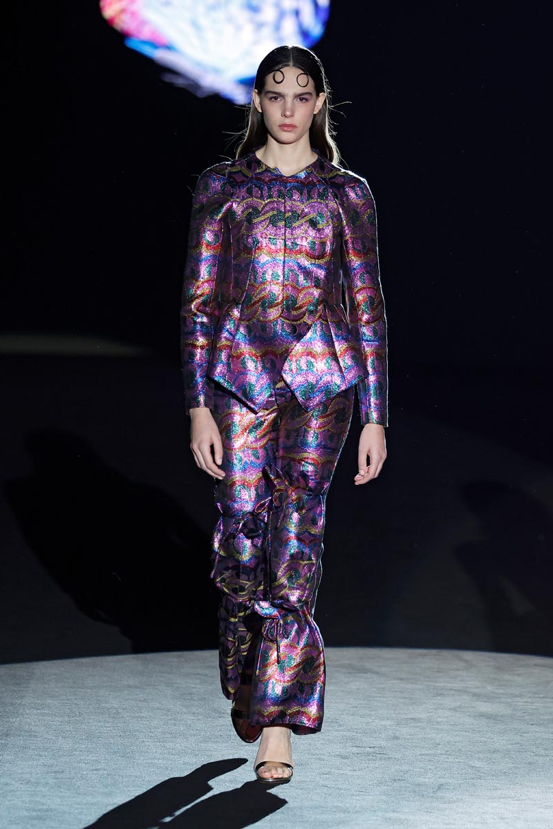 The fashion designer presents her iconic jewel coats that are construed with large volumes on the sleeves and flow down, to the floor. Long shirt dresses with ruffles on the sleeves and mega-short print dresses decorated with crystal details, Perfecto style jackets and beaded jumpsuits. Leggings, with a bow finished with butterfly-shaped pearls are the collection’s leitmotiv.