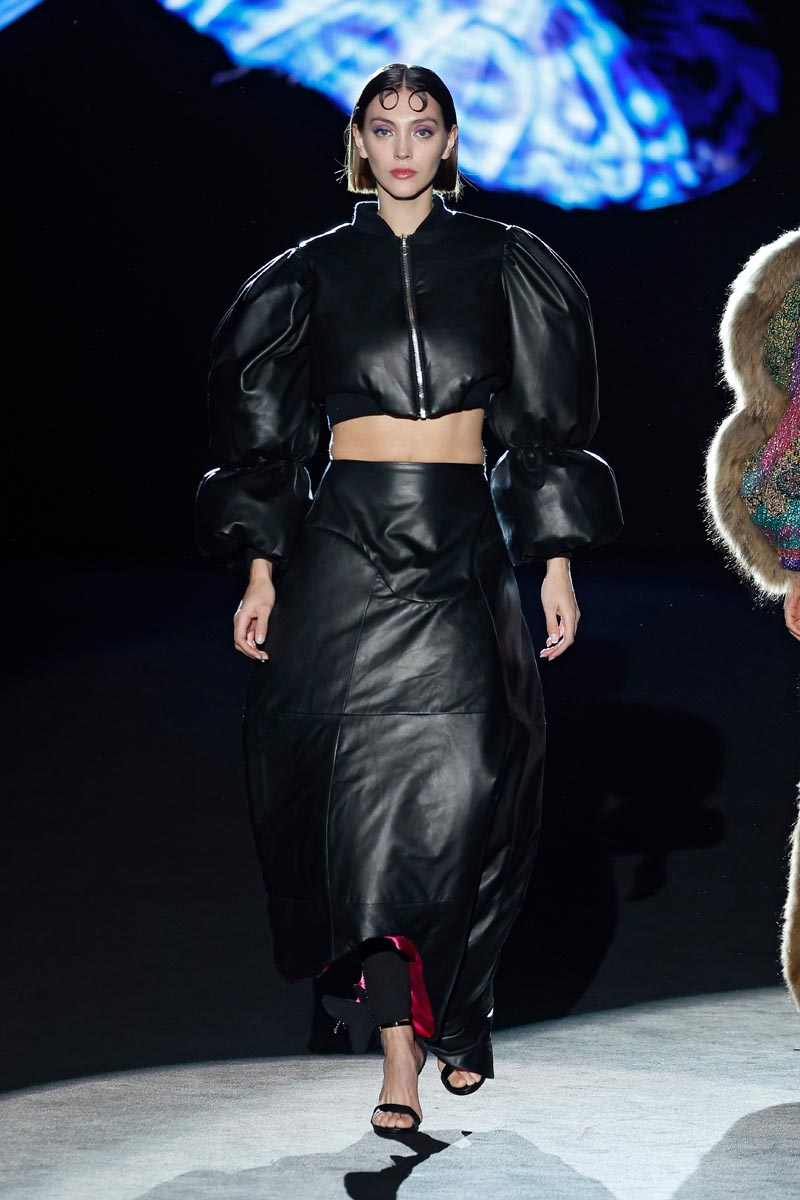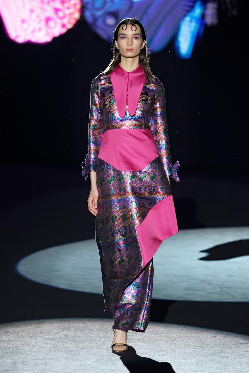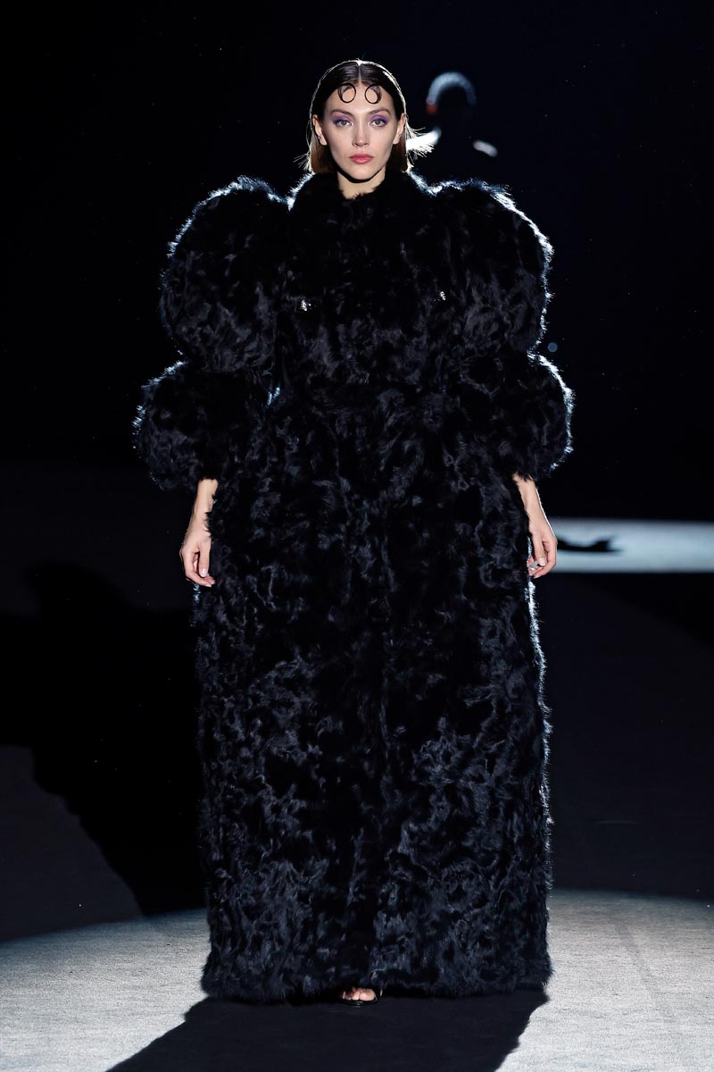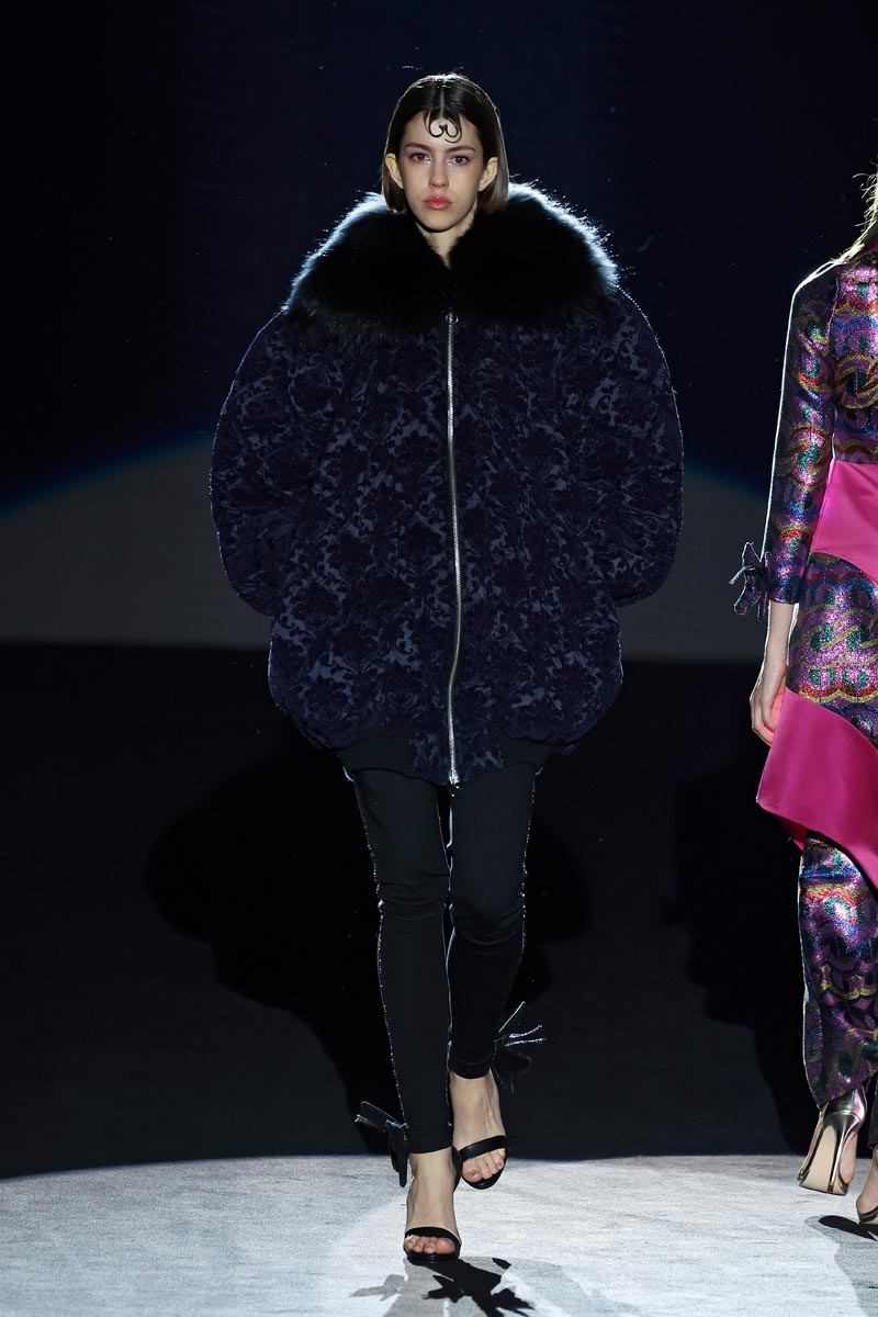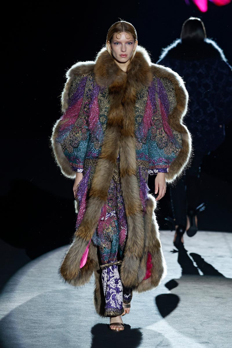 As for the materials, fabrics decorated with lurex and brocade stand out together with cloth in vibrant tones, taffeta with geometric and abstract flower prints, shiny and matt quilts and velvet with microcrystals and pearls. Farm-raised marmot, lamb and fox furs are represented in some of the collection’s coat pieces.