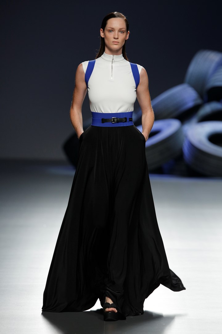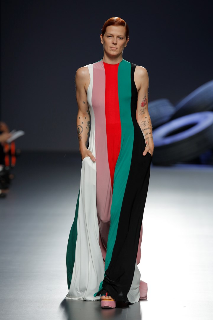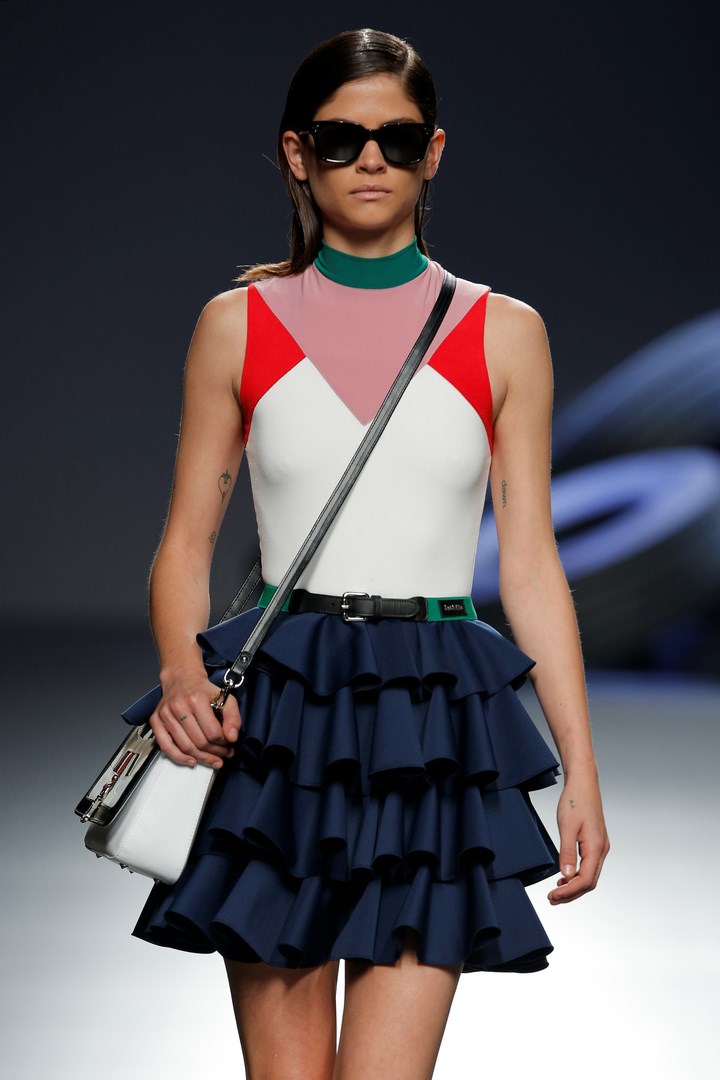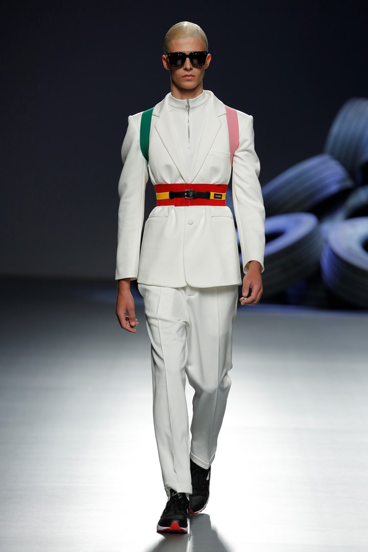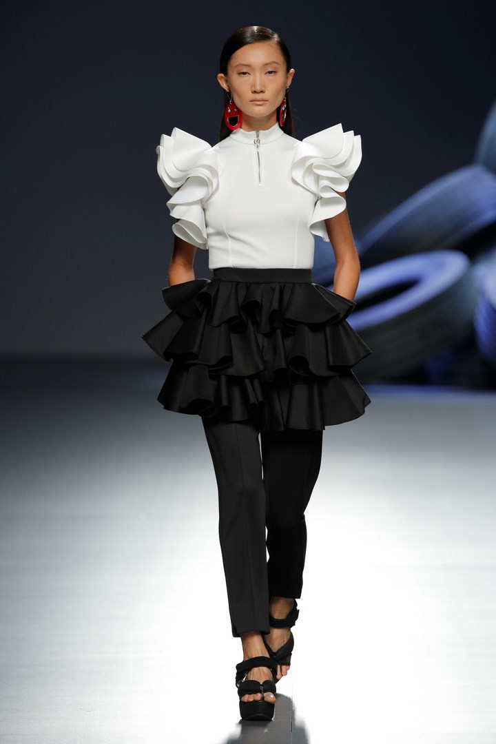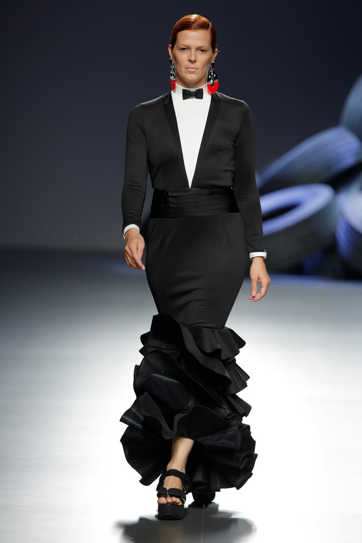 Davidelfin breaks away from the darkness of his previous collections to present “Psoas” a proposal in which he reveals his passion for sport, embodied in a partnership with Nike. Sportswear garments contrast with feminine looks of flamenco inspiration. The work that the designer from Málaga has carried out in “Carmen”, for the National Dance Company, has been the starting point to create a collection filled with ruffles taken to the Delfín territory with zippers to dismantle them, and a merging with patterns from more classical tailoring.
