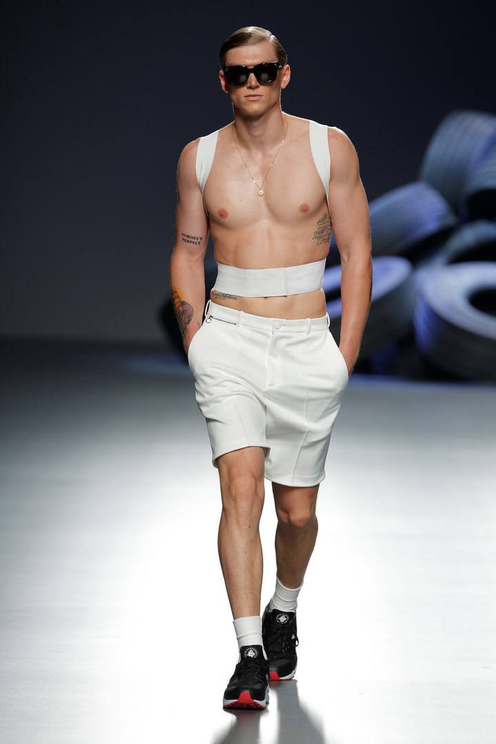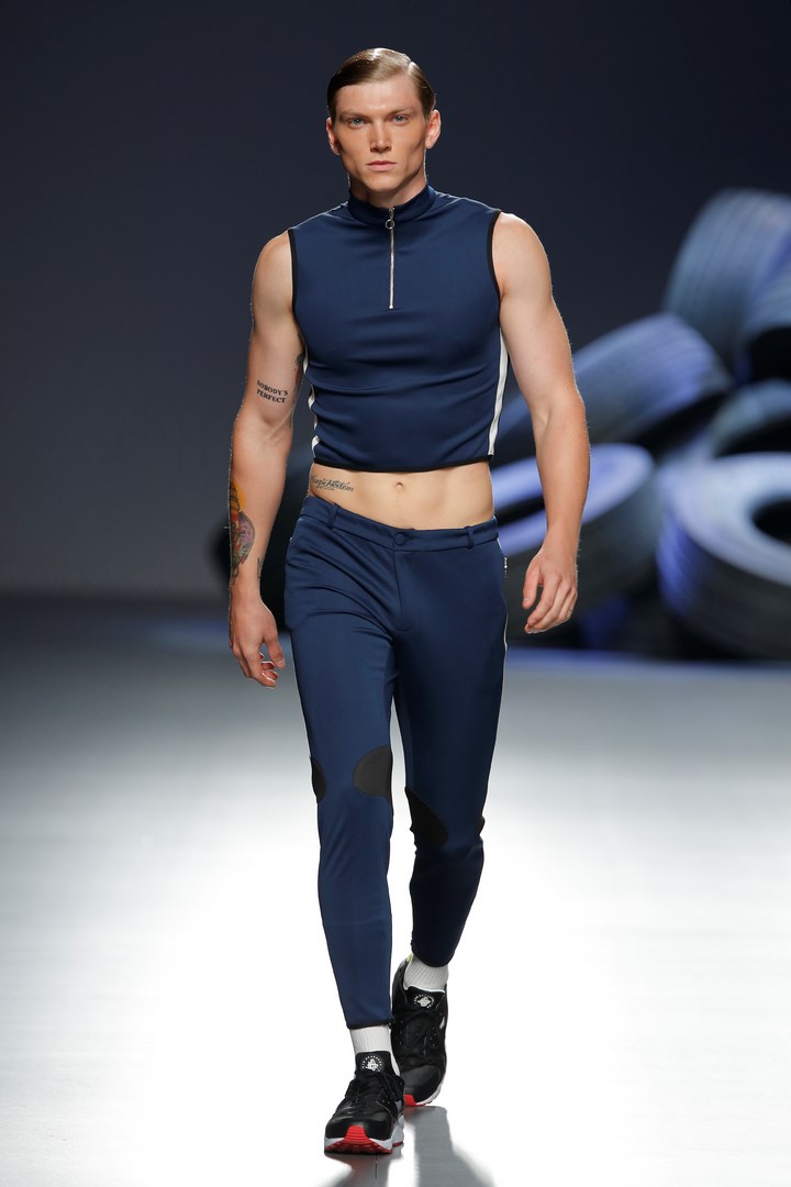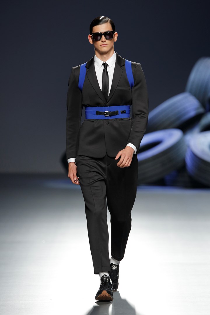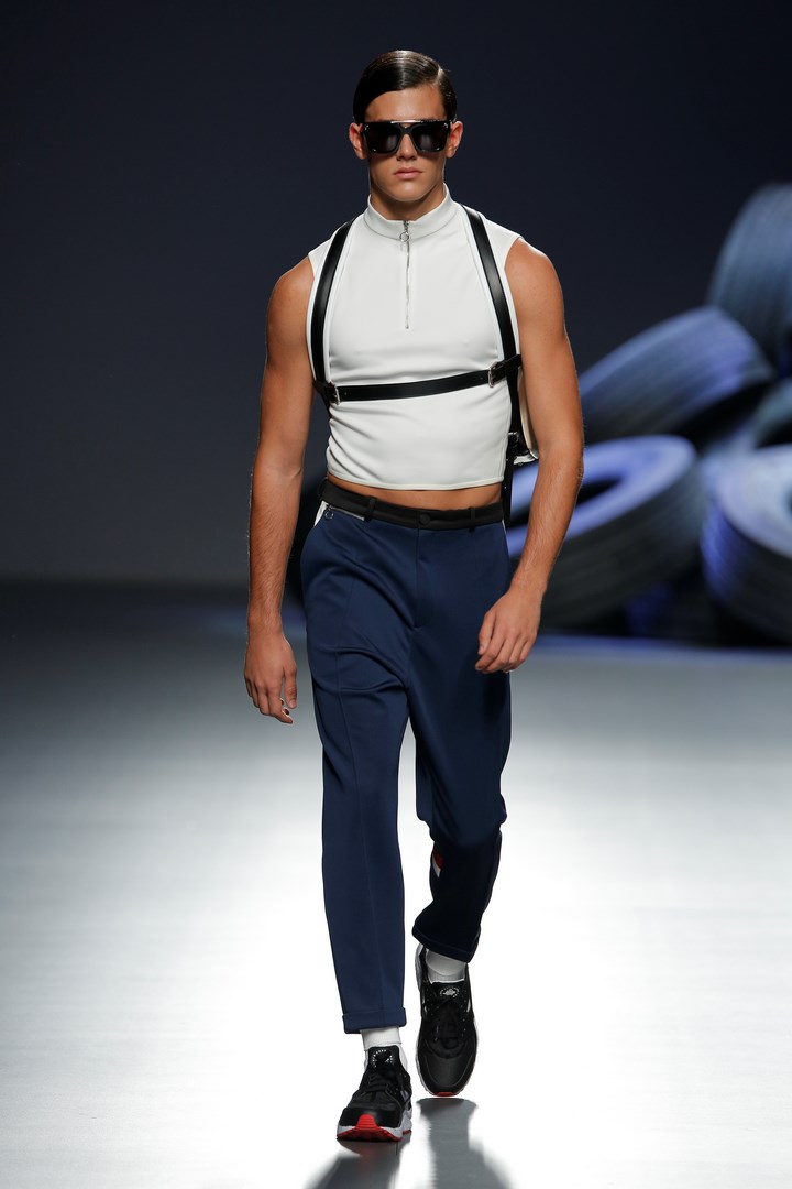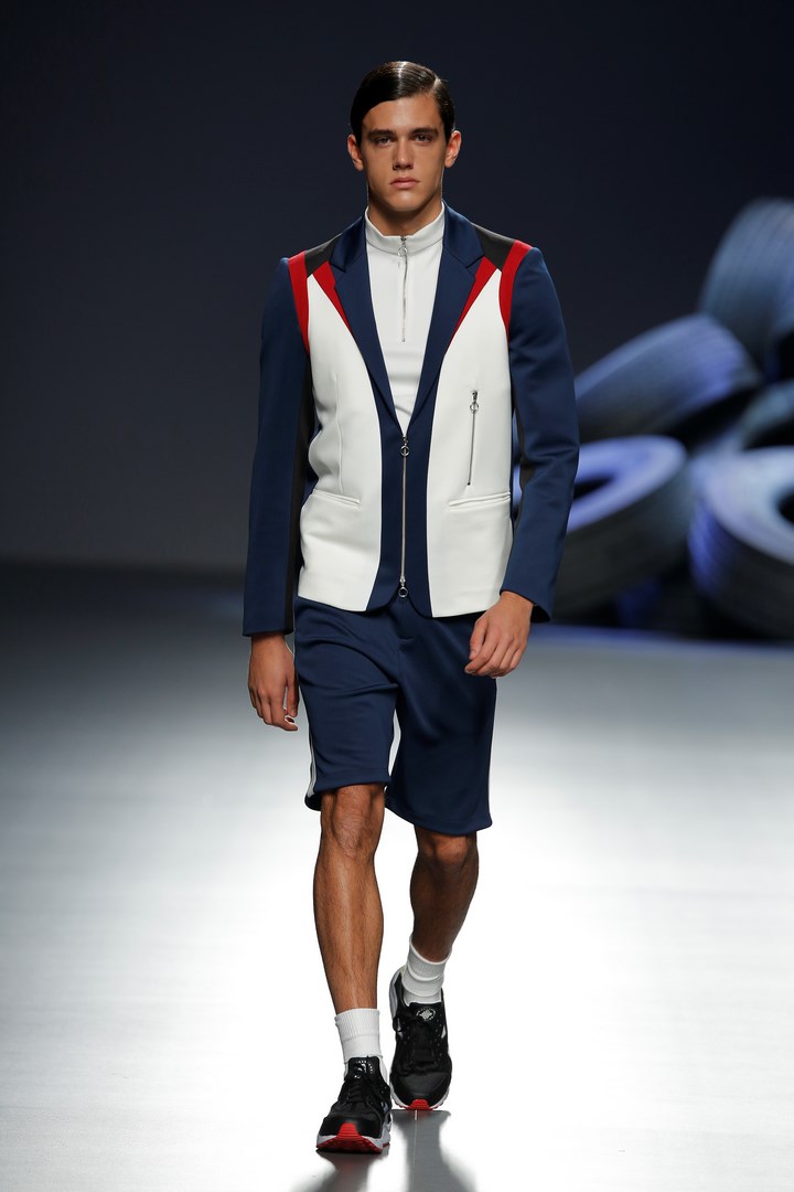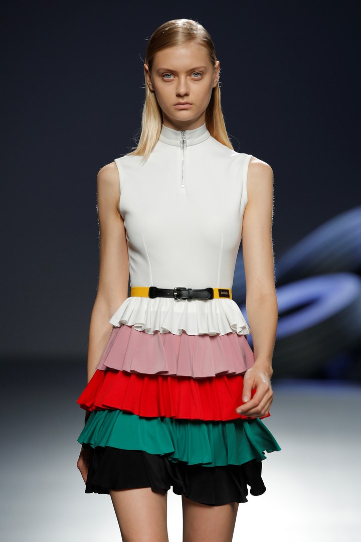 Davidelfin breaks away from the darkness of his previous collections to present “Psoas” a proposal in which he reveals his passion for sport, embodied in a partnership with Nike. Sportswear garments contrast with feminine looks of flamenco inspiration. The work that the designer from Málaga has carried out in “Carmen”, for the National Dance Company, has been the starting point to create a collection filled with ruffles taken to the Delfín territory with zippers to dismantle them, and a merging with patterns from more classical tailoring.