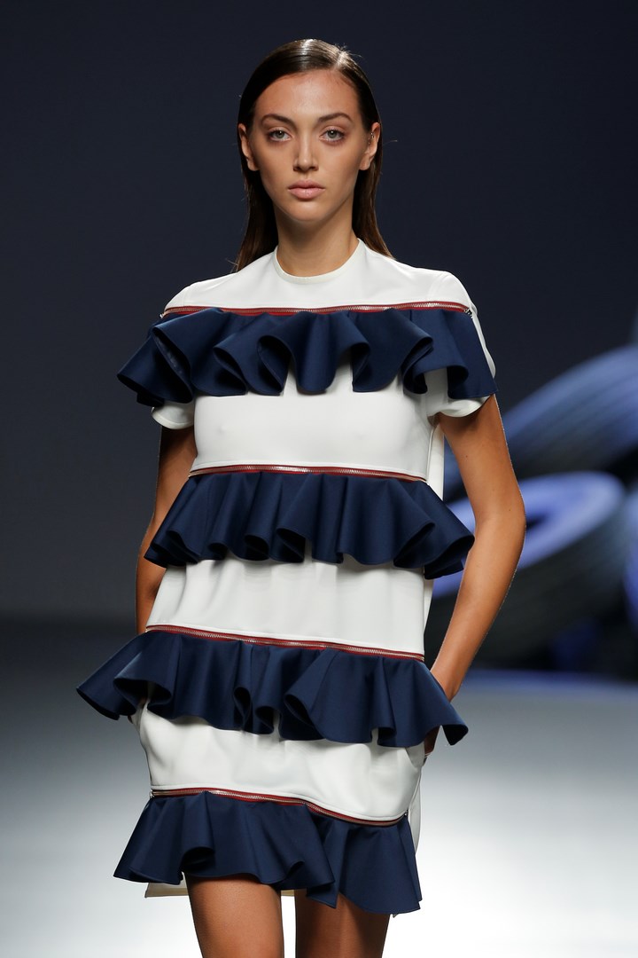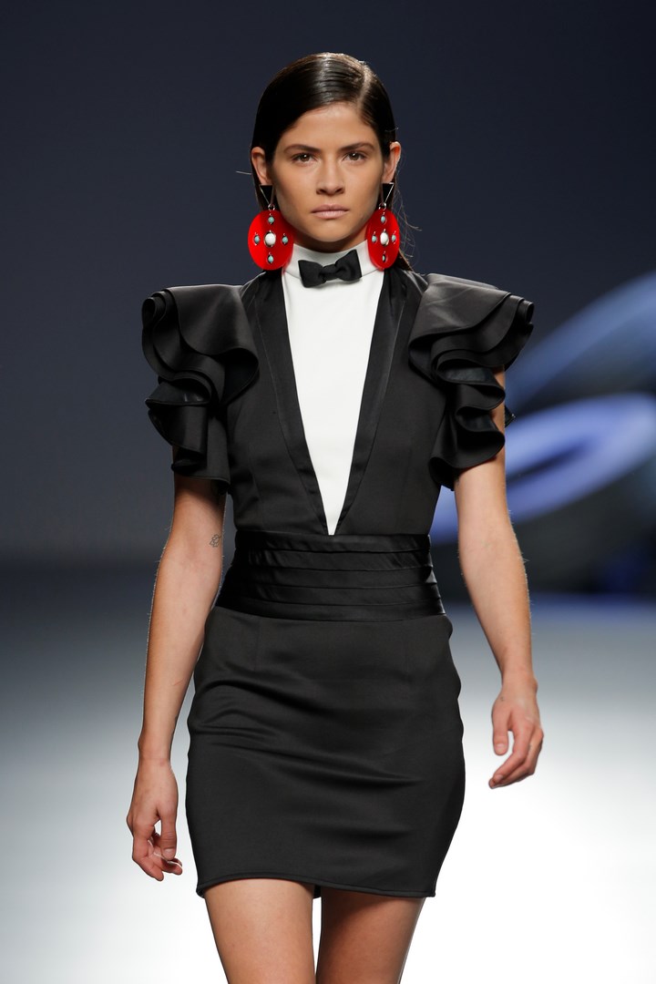 Juana Martin celebrates her 10th anniversary on the runway of Mercedes Benz Fashion Week Madrid with “Ten-plè,” a collection that reviews the more flamenco origins of the label. Fresh and sophisticated, the designer from Cordoba show cases on the catwalk a proposal that plays with the white / black binomial, dotted by golden touches and by garments in lime colour. Natural fabrics like chiffon and silk gazar blend with vinyl inlays, providing a bohemian air to her creations for next spring-summer season.