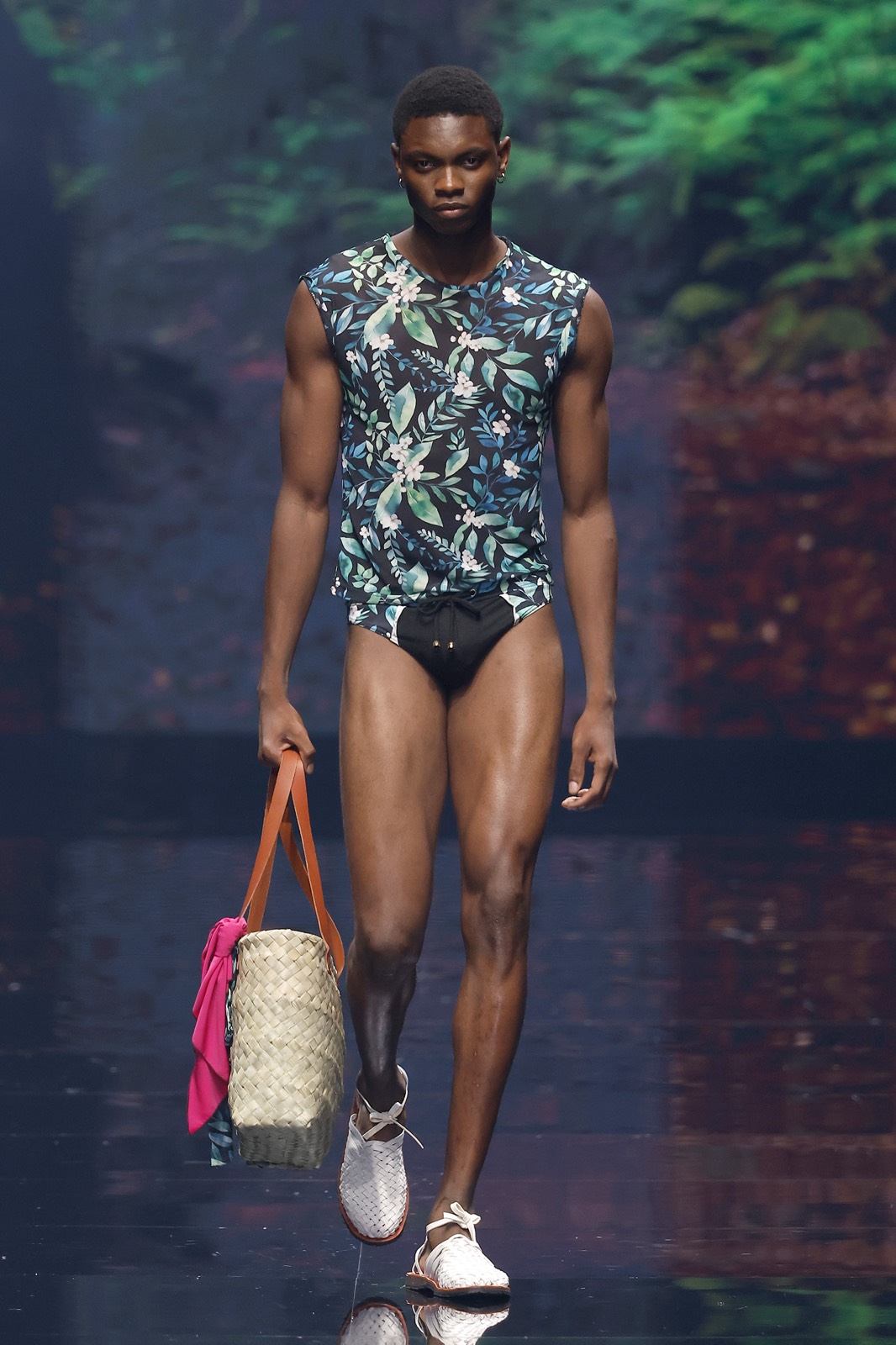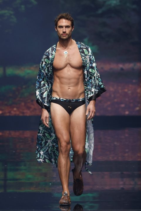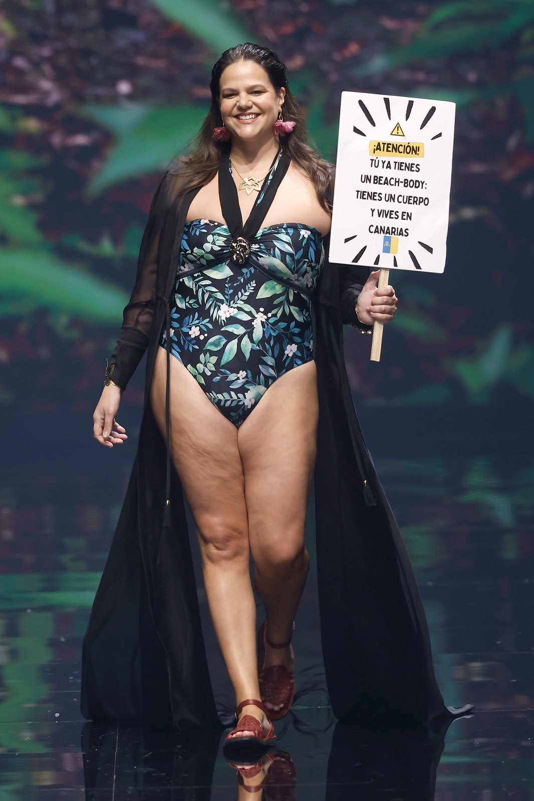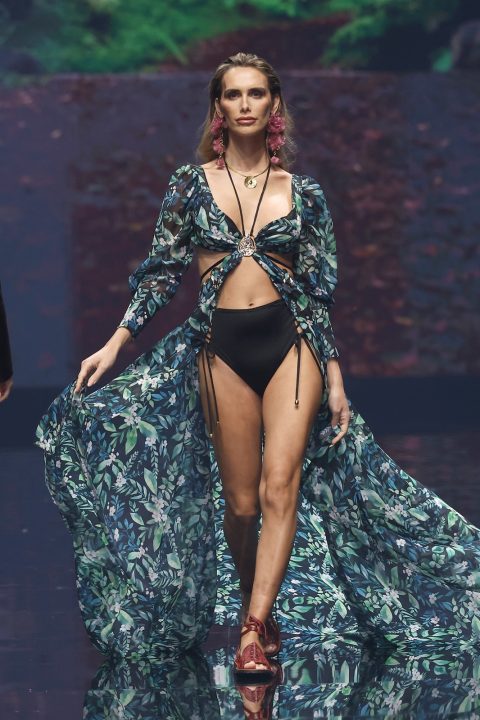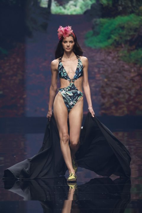 Los colores beben de la densidad del monteverde: negros lava, verdes minerales, marrones corteza, blancos flor y destellos dorados que se abren paso entre la penumbra, con un fucsia autóctono como irrupción vital. Los materiales —cuero reciclado, tejidos ecológicos y lycras sostenibles— aportan textura y coherencia ética. La colección se completa con joyas y complementos de autor de artesanos palmeros, piezas escultóricas que refuerzan el diálogo entre tradición y vanguardia.