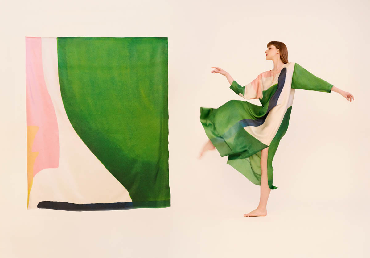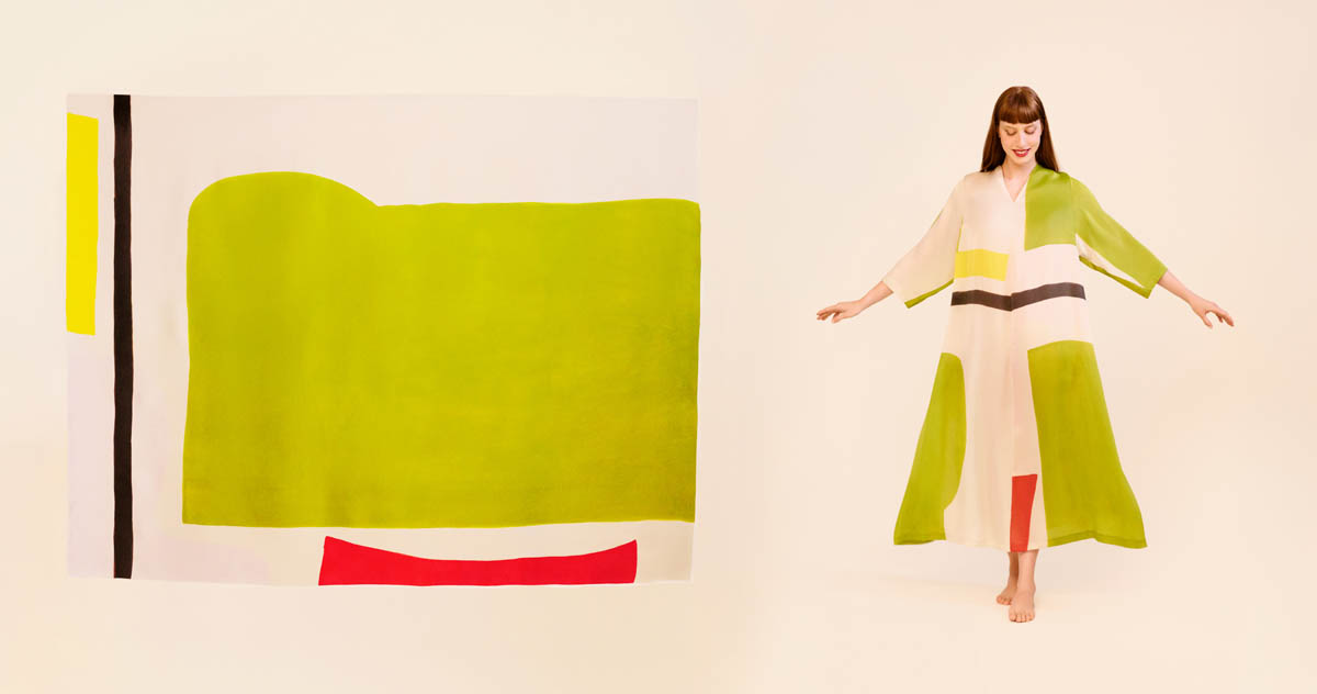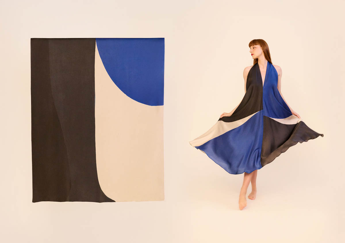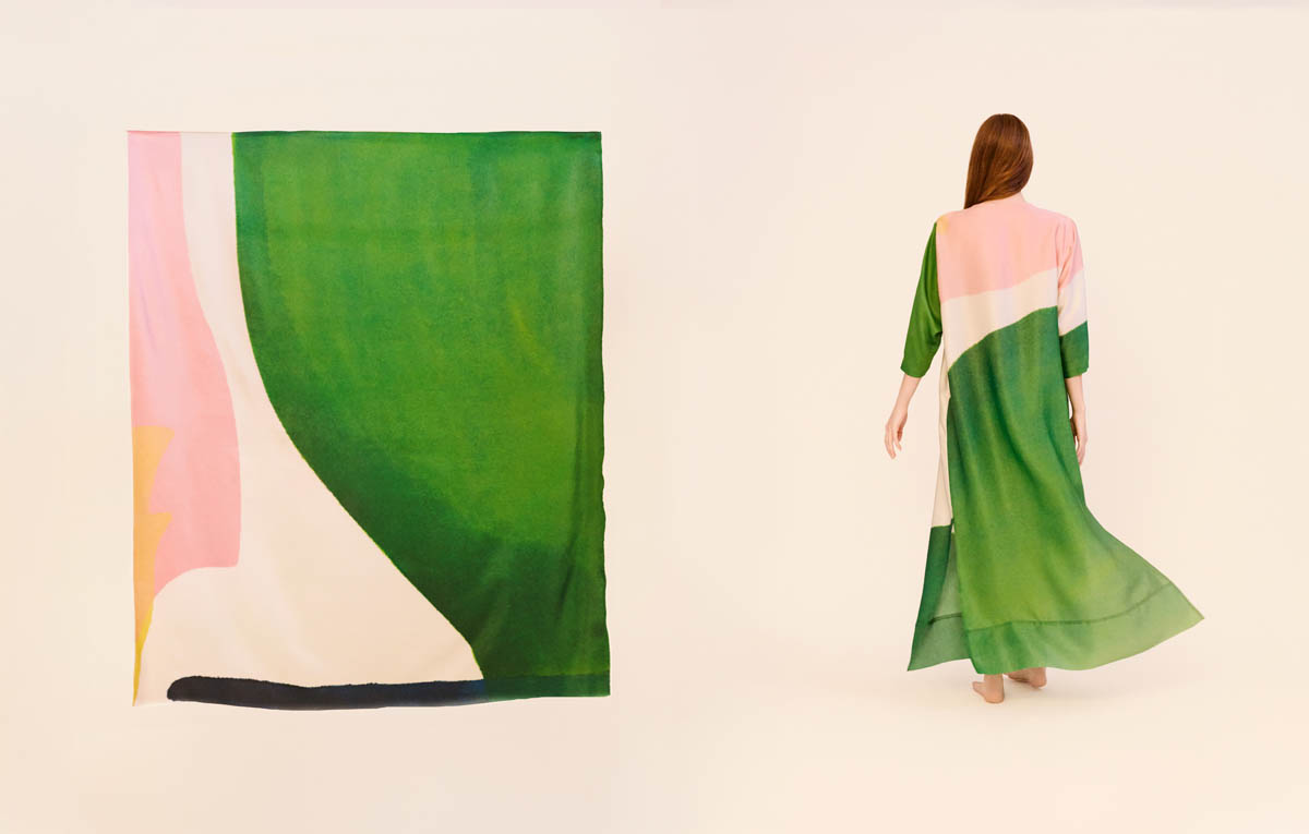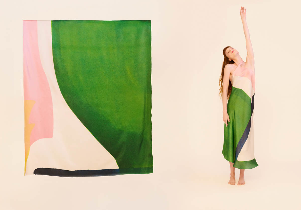 Las piezas, realizadas en seda ligera, despliegan patrones elaborados y favorecedores que buscan dulzura, sensualidad y ligereza. Los colores vibrantes de las pinturas de Amor adquieren movimiento sobre el cuerpo, transformando la tela en superficie pictórica. El resultado son vestidos versátiles, concebidos para acompañar la vida cotidiana sin renunciar a la emoción artística.