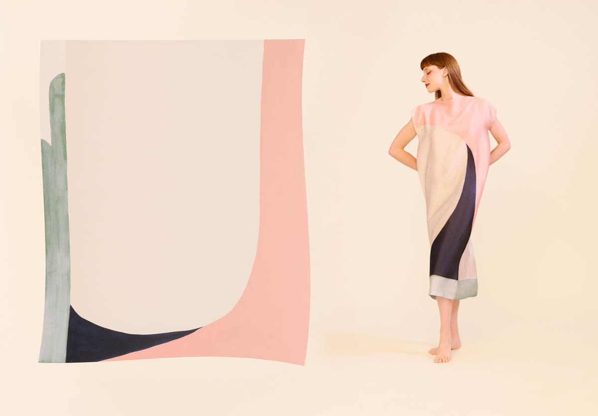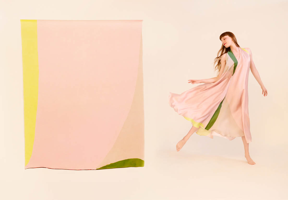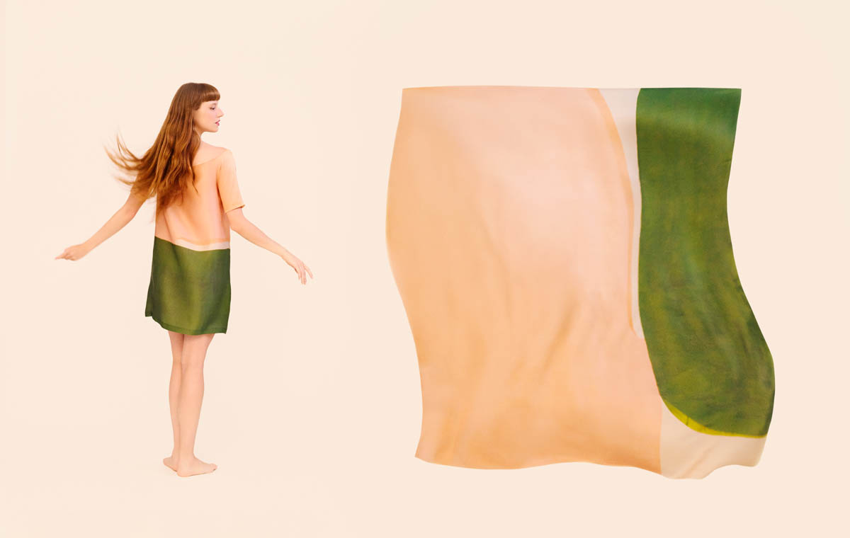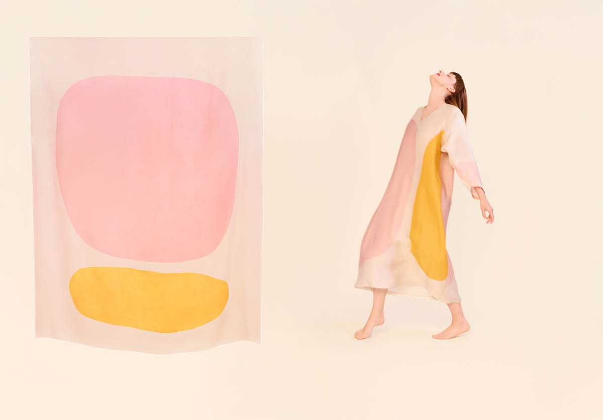 Las piezas, realizadas en seda ligera, despliegan patrones elaborados y favorecedores que buscan dulzura, sensualidad y ligereza. Los colores vibrantes de las pinturas de Amor adquieren movimiento sobre el cuerpo, transformando la tela en superficie pictórica. El resultado son vestidos versátiles, concebidos para acompañar la vida cotidiana sin renunciar a la emoción artística.