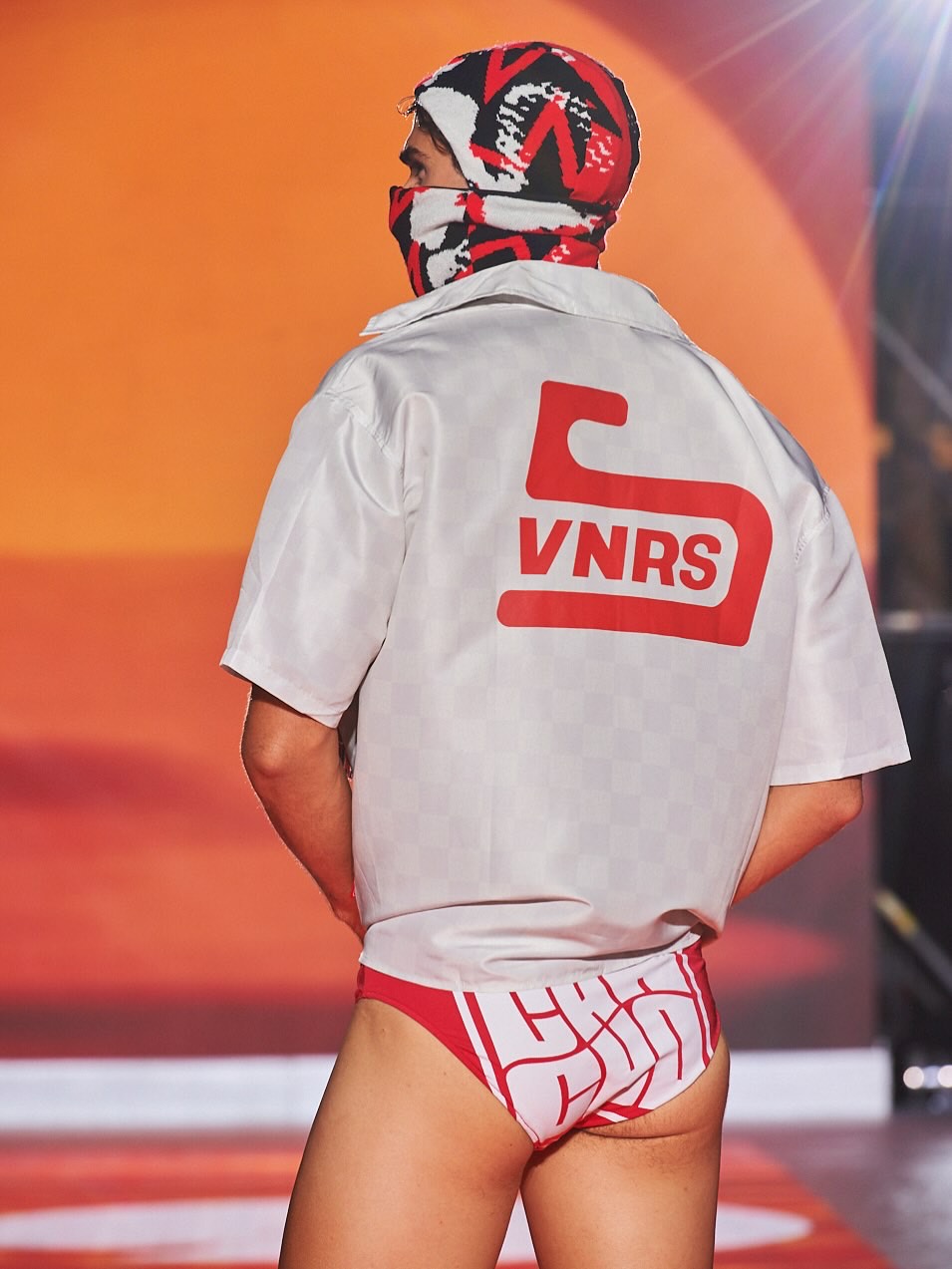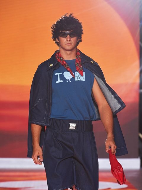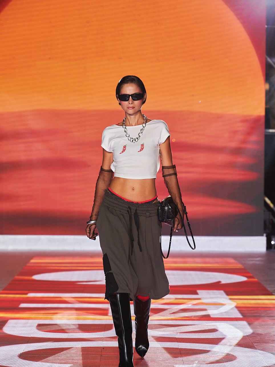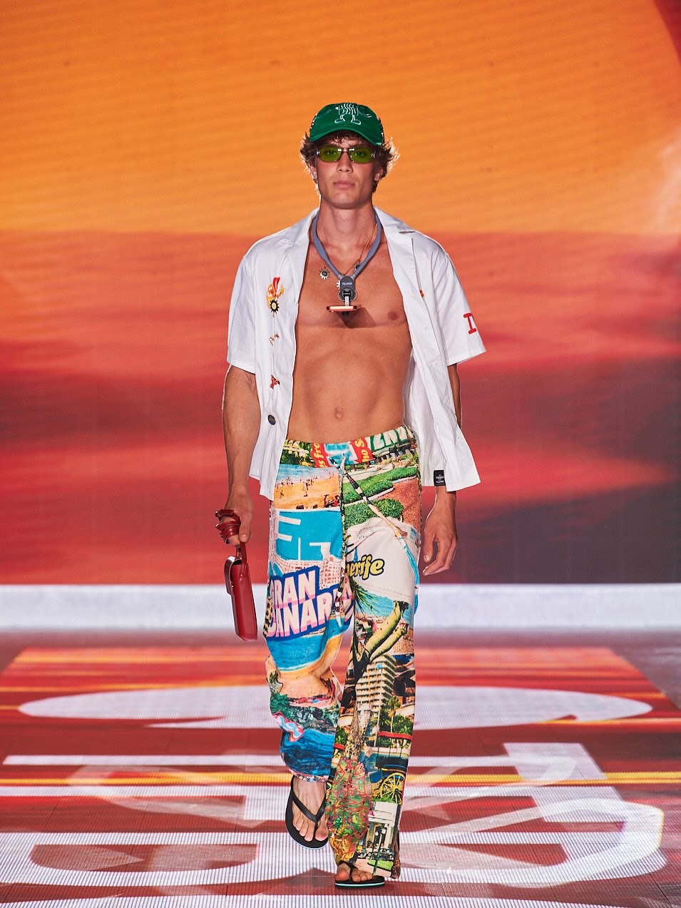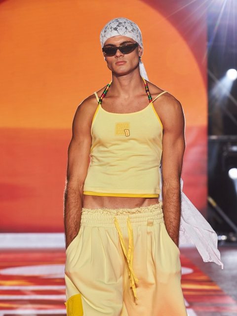 En escena, la propuesta se articula en 14 looks (7 femeninos y 7 masculinos) y demuestra que la moda de baño puede trascender su función para dialogar con lo cotidiano: oversize de inspiración skater, bermudas relajadas, micro tops y camisetas gráficas conviven con bikinis y bañadores, subrayando un armario mixto pensado para el día a día y la playa como espacio cultural.