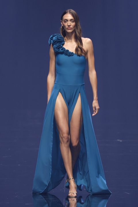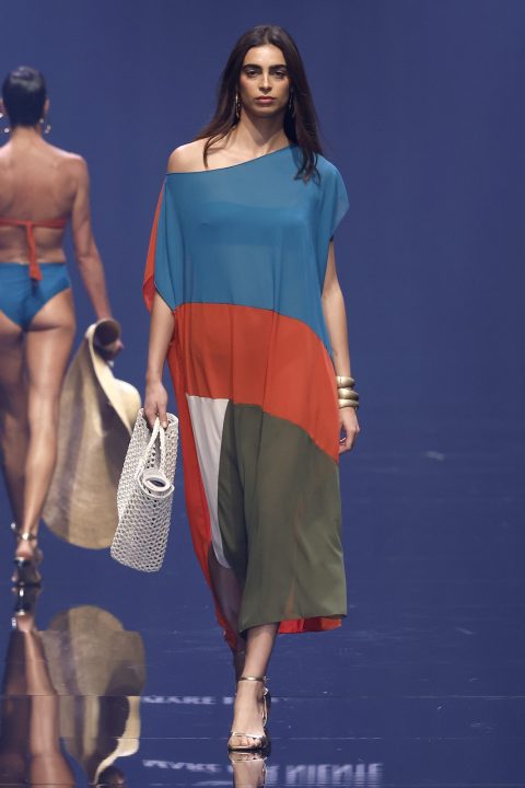 Las siluetas fluyen con naturalidad, suaves y envolventes, casi líquidas. Los tejidos, ligeros y táctiles, acompañan el movimiento sin imponerlo. En la paleta cromática dialogan los tonos de la tierra, el mar y el cielo —coral, caqui, terracota, turquesa y ocre—, generando una armonía cálida y sensorial. El resultado es una atmósfera de quietud luminosa, donde la artesanía y la autenticidad se funden con la calma.