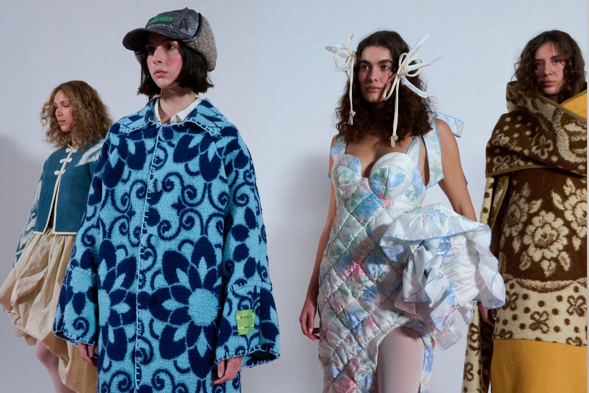 Las mantas aparecen como punto de partida material y simbólico, acompañadas por visillos y cortinas que introducen otra ligereza en la construcción de las piezas. Ese encuentro entre densidad y transparencia define el ritmo visual de la colección. Las siluetas alternan estructuras firmes con drapeados y volúmenes más sueltos, dejando que cada tejido marque su propio comportamiento sobre el cuerpo. La paleta nace de los propios estampados de las mantas y se equilibra con los blancos luminosos de los visillos. Cada prenda pasa por un proceso de deconstrucción y reconstrucción en el taller de la firma, que transforma estos materiales en piezas únicas producidas en edición limitada.